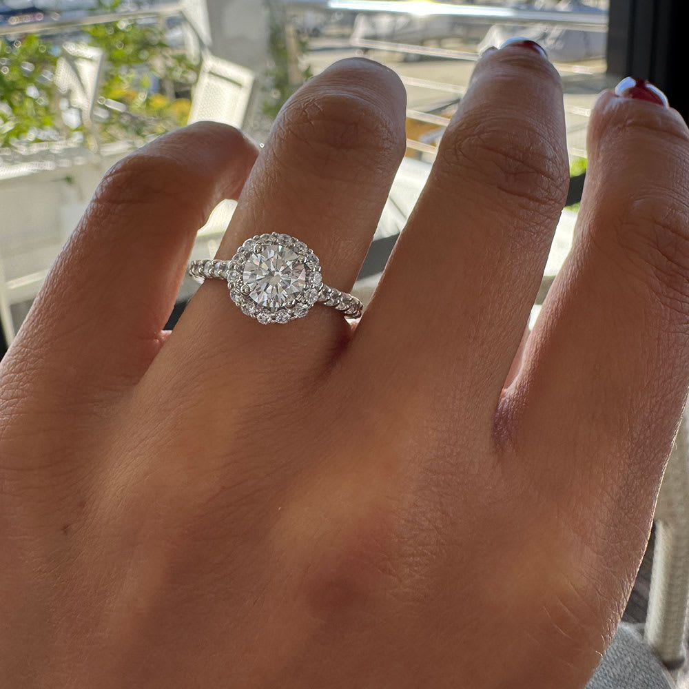 This women's engagement ring features a glittering round brilliant diamond as it's focal point. Surrounding the central diamond is a graceful halo of smaller diamonds, delicately set to enhance the brilliance of the main stone even further. The shanks are adorned with round stones, adding an extra layer of radiance and luxury. All Temple and Grace jewellery is beautifully crafted to the highest standards and is made at our jewellery workshop directly by us (skilled jewellery craftsmen). This is why you can save over 40% when compared to high-street retail prices. We also offer a lifetime warranty and unmatched 100 day returns. You can shop online or book an appointment to visit our jewellery boutiques in Sydney, Melbourne, Brisbane, Perth and Adelaide.