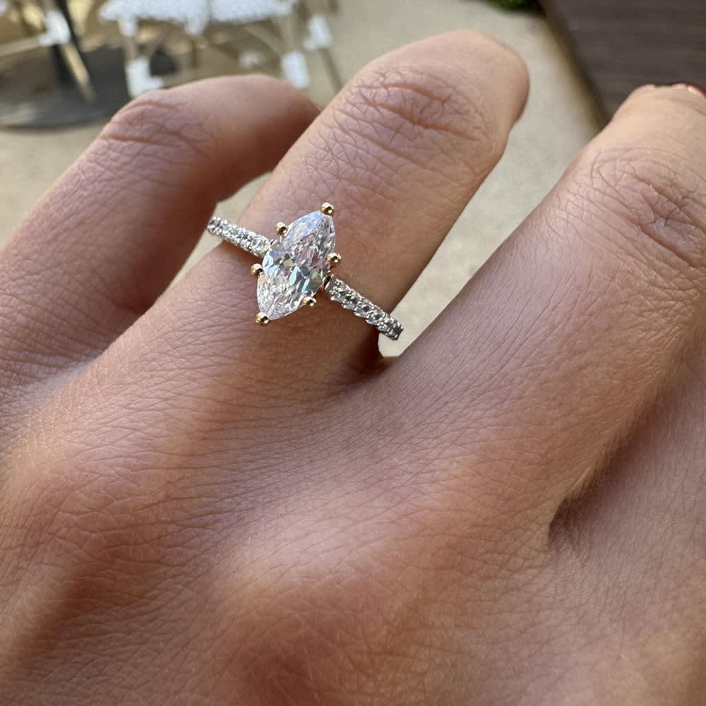 This women's engagement ring features a stunning marquise shaped diamond as it's focal point. It is securely held in place by a strong six prong setting. To further enhance it's allure, the polished shanks are embellished with smaller round diamonds. The tiny diamonds create a subtle yet dazzling contrast against the polished metal, making the ring even more radiant and captivating. All Temple and Grace jewellery is beautifully crafted to the highest standards and is made at our jewellery workshop directly by us (skilled jewellery craftsmen). This is why you can save over 40% when compared to high-street retail prices. We also offer a lifetime warranty and unmatched 100 day returns. You can shop online or book an appointment to visit our jewellery boutiques in Sydney, Melbourne, Brisbane, Perth and Adelaide.