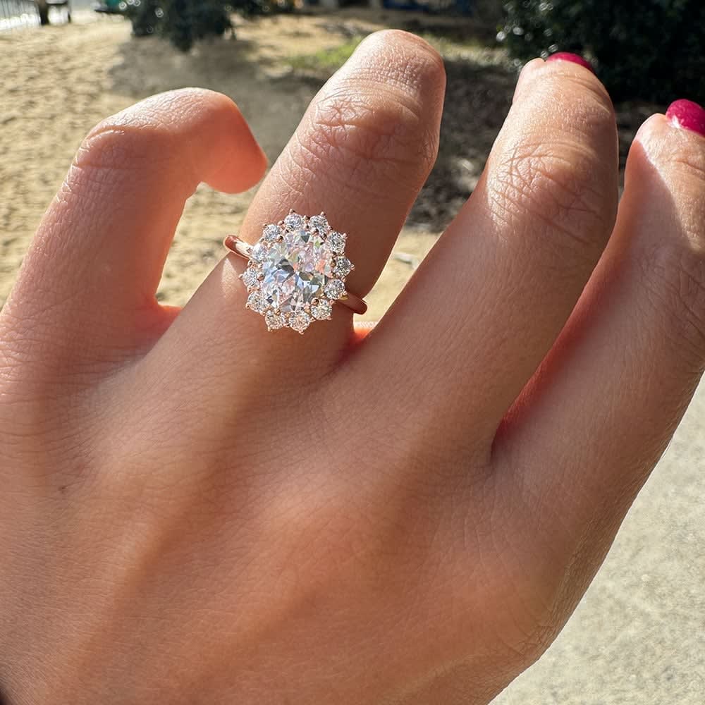 Gorgeous 3 carat 0val lab grown diamond with a touch of vintage. How romantic. This would truly be a romantic engagement ring to be given to any woman who loves romantic gestures. Available in rose, white and yellow gold Ask our professional sales advisors for any assistance