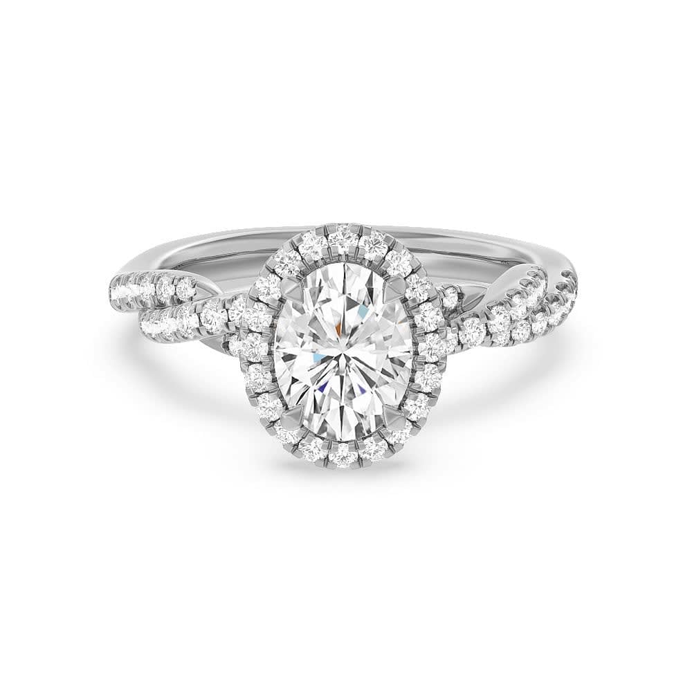 This women's engagement ring's centre stone is an oval shaped lab diamond that is encircled by a halo of sparkling diamonds. It has beautiful pave stone strands twisted together to form the band. Anyone who appreciates classic design with a modern touch will love the timeless and chic appearance that the twisted pave band creates. All Temple and Grace jewellery is beautifully crafted to the highest standards and is made at our jewellery workshop directly by us (skilled jewellery craftsmen). This is why you can save over 40% when compared to high-street retail prices. We also offer a lifetime warranty and unmatched 100 day returns. You can shop online or book an appointment to visit our jewellery boutiques in Sydney, Melbourne, Brisbane, Perth and Adelaide.