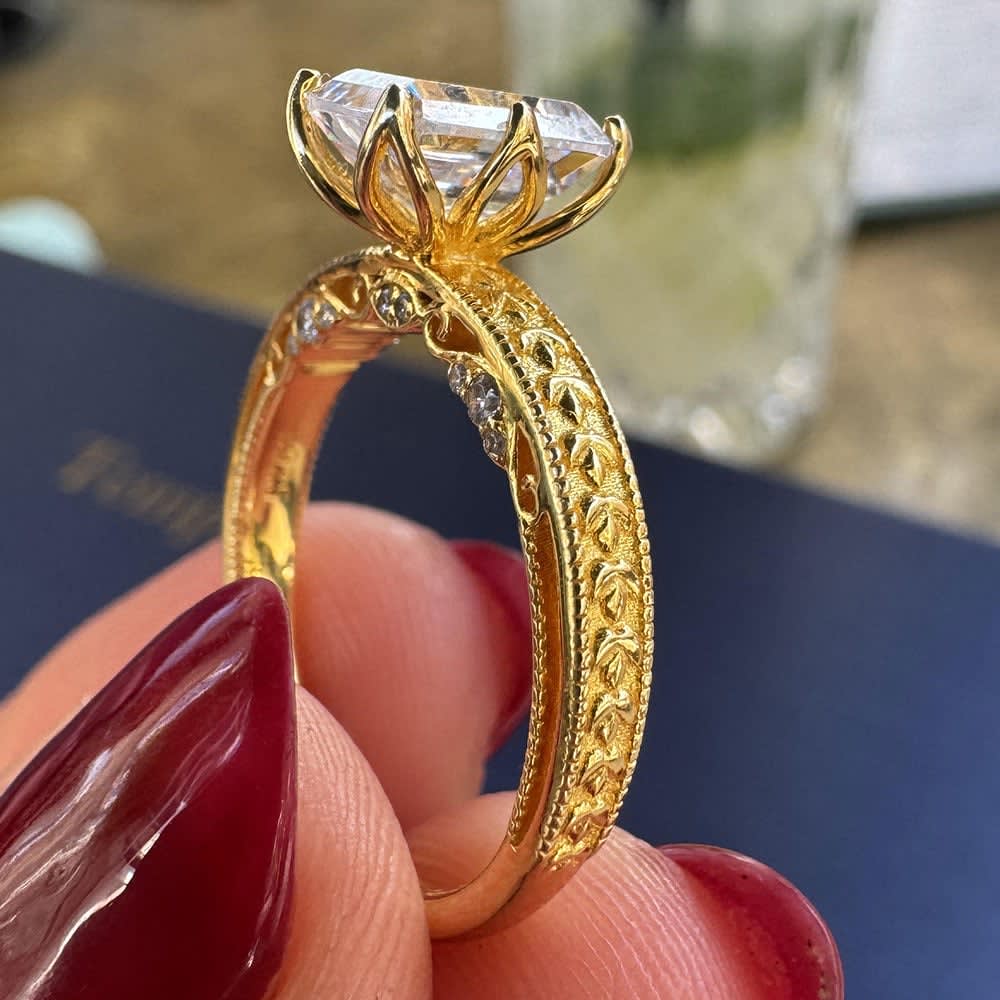 Such a vintage design, romantic with all the fine engraving. A special design for a special occasion. With fine detail on the sides of the ring set with beautiful diamonds. The fine details will stand out as our jewellers craftsmanship is to perfection. Available in rose, white and yellow gold. Ask our professional sales advisors for any assistance.