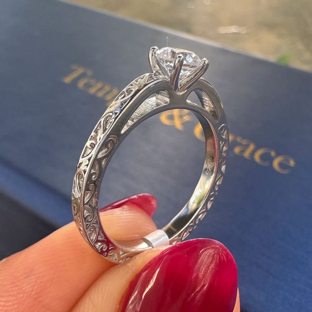 Chic and sophisticated, this lovely solitaire engagement ring is crafted in 14K white gold and showcases an intricate design. It is composed of a lustrous hand-carved shank with milgrain borders and is adorned with a 0.50ct scintillating diamond in a claw setting. This stunning band emanates a modern flair. The ring is available in 18K white, yellow, rose gold, and platinum 950. The jewellery is beautifully handmade to the highest standards. Shop directly from us and save over 40% when compared to high-street retail prices. We also offer unmatched 100 day returns. Buy online or book an appointment to visit our jewellery boutiques in Sydney and Melbourne.
