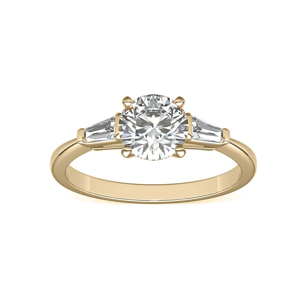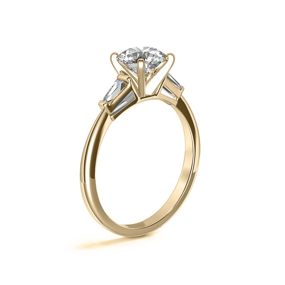 Impeccably crafted this dazzling diamond band is the essence of elegance and modernity. It features two tapered baguette-cut diamonds set in classic bar channels, brilliantly framing the center stone. The iconic engagement ring offers a petite silhouette with timeless style. It is available in 18K white, yellow, rose gold, and platinum 950. The jewellery is beautifully handmade to the highest standards. Shop directly from us and save over 40% when compared to high-street retail prices. We also offer unmatched 100 day returns. Buy online or book an appointment to visit our jewellery boutiques in Sydney and Melbourne.