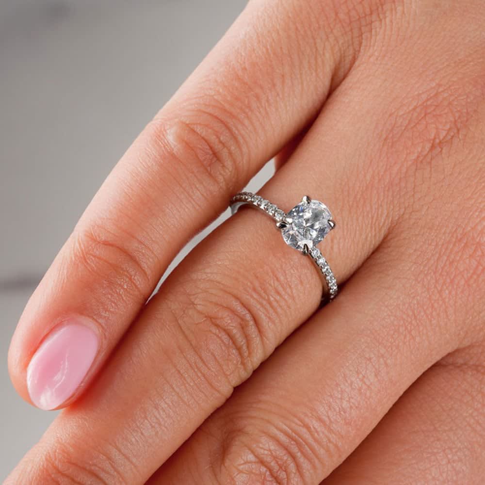 This stunning engagement ring features an oval cut diamond set secured by elegant and tapered prongs. The brilliant round cut diamonds set on the band's outer edge enhance its emergence. This engagement ring's alluring brilliance glistens and shines to create beautiful moments. This ring is available in 18K white, yellow, rose gold, platinum 600, and platinum 950. The jewellery is beautifully handmade to the highest standards. Shop directly from us and save over 40% when compared to high-street retail prices. We also offer unmatched 100 day returns. Buy online or book an appointment to visit our jewellery boutiques in Sydney, Melbourne and Brisbane.