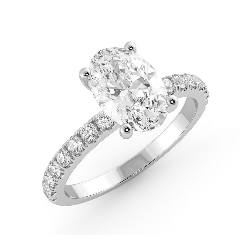 This stunning engagement ring features an oval cut diamond set secured by elegant and tapered prongs. The brilliant round cut diamonds set on the band's outer edge enhance its emergence. This engagement ring's alluring brilliance glistens and shines to create beautiful moments. This ring is available in 18K white, yellow, rose gold, platinum 600, and platinum 950. The jewellery is beautifully handmade to the highest standards. Shop directly from us and save over 40% when compared to high-street retail prices. We also offer unmatched 100 day returns. Buy online or book an appointment to visit our jewellery boutiques in Sydney, Melbourne and Brisbane.