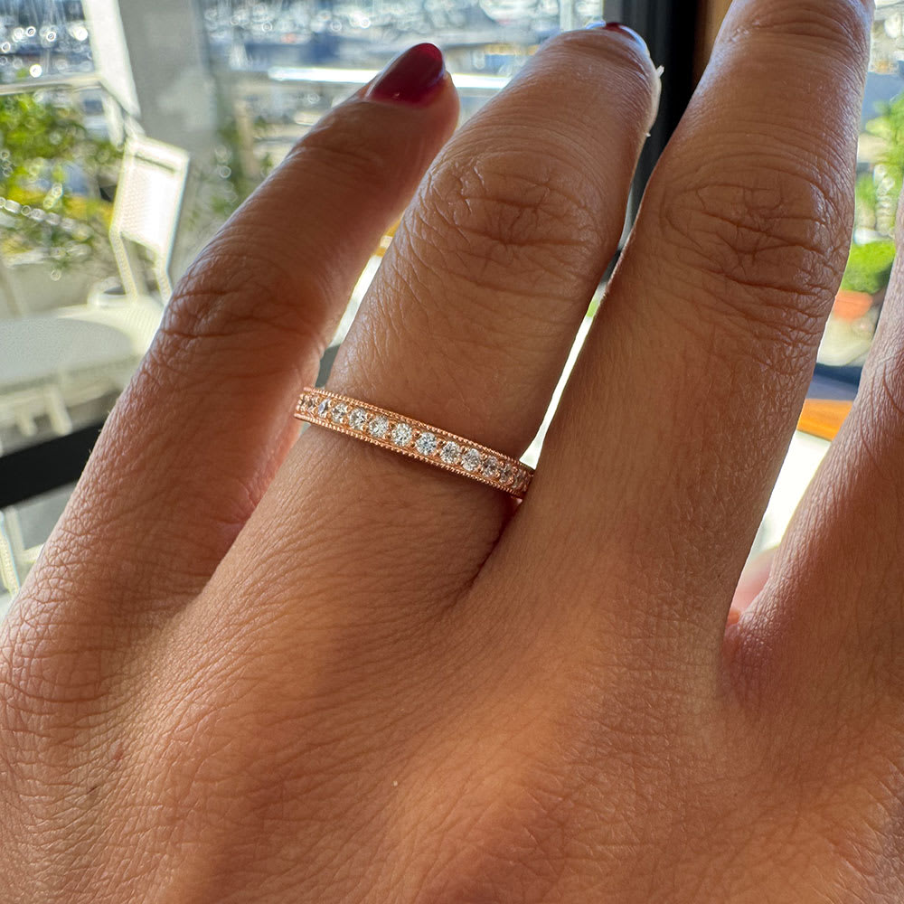 This band whispers timeless elegance. A delicate row of pave-set diamonds stretches around the band, catching light with every movement and giving just the right amount of sparkle without overwhelming. Along the edges, fine migraine detailing adds a soft, textured border a vintage-inspired touch that frames the diamonds like lace, lending warmth and character. All Temple and Grace jewellery is beautifully crafted to the highest standards and is made at our jewellery workshop directly by us (skilled jewellery craftsmen). This is why you can save over 40% when compared to high-street retail prices. We also offer a lifetime warranty and unmatched 100 day returns. You can shop online or book an appointment to visit our jewellery boutiques in Sydney, Melbourne, Brisbane, Perth and Adelaide.