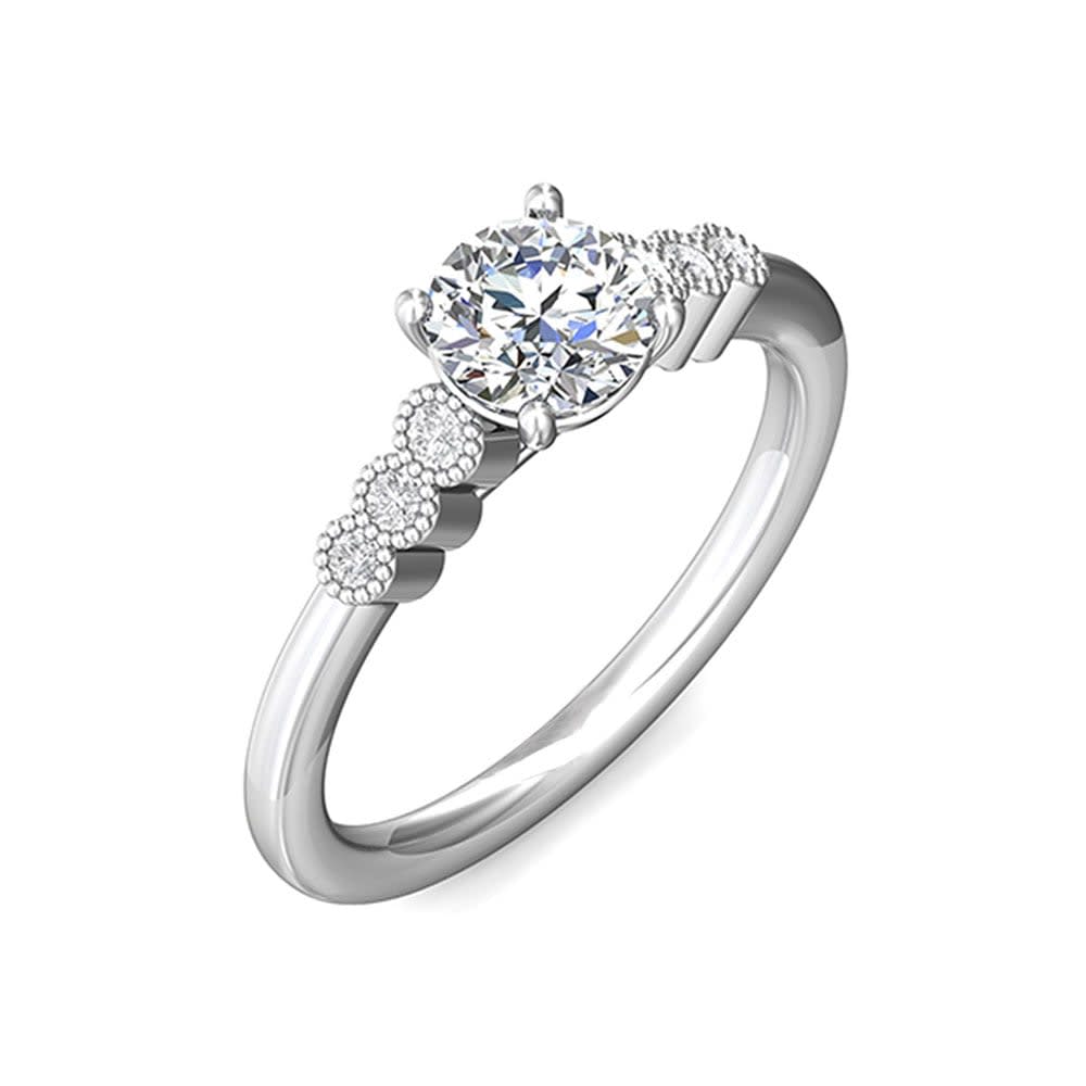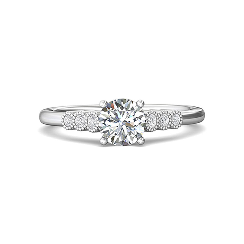 Classic in appearance, the incredible diamond band exudes effortless elegance. It showcases a GIA certified 0.40 carat round diamond secured in a claw setting along with three scintillating diamonds on the sides adorned with milgrain work on the edges. The distinctive pattern of this adorable engagement ring is truly captivating. This band is available in 18K white, yellow, rose gold, and platinum 950. The jewellery is beautifully handmade to the highest standards. Shop directly from us and save over 40% when compared to high-street retail prices. We also offer unmatched 100 day returns. Buy online or book an appointment to visit our jewellery boutiques in Sydney and Melbourne.
