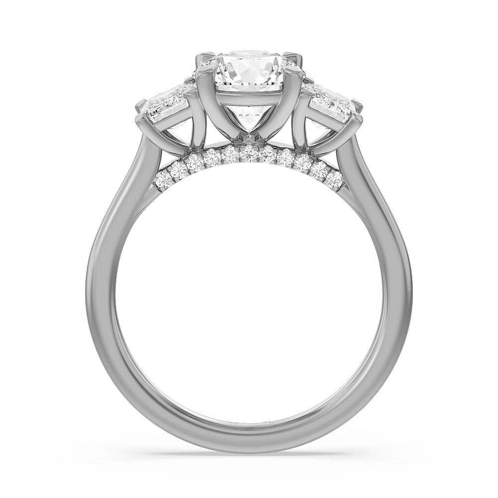 This women's engagement ring is a stunning sparkler that exudes charm and elegance. The ring features three glittering stones that stand tall and proud atop a shiny band. The centre stone is flanked by two smaller stones, creating a beautiful and balanced design. The three stones symbolize the past, present, and future of the relationship, making this ring a meaningful choice for an engagement ring. The band's bridge is adorned with a row of accent diamonds, adding extra sparkle and creating a cohesive look. The combination of the centre stones and accent diamonds creates a ring that will turn heads and captivate onlookers. All Temple and Grace jewellery is beautifully crafted to the highest standards and is made at our jewellery workshop directly by us (skilled jewellery craftsmen). This is why you can save over 40% when compared to high-street retail prices. We also offer a lifetime warranty and unmatched 100 day returns. You can shop online or book an appointment to visit our jewellery boutiques in Sydney, Melbourne, Brisbane and Perth.
