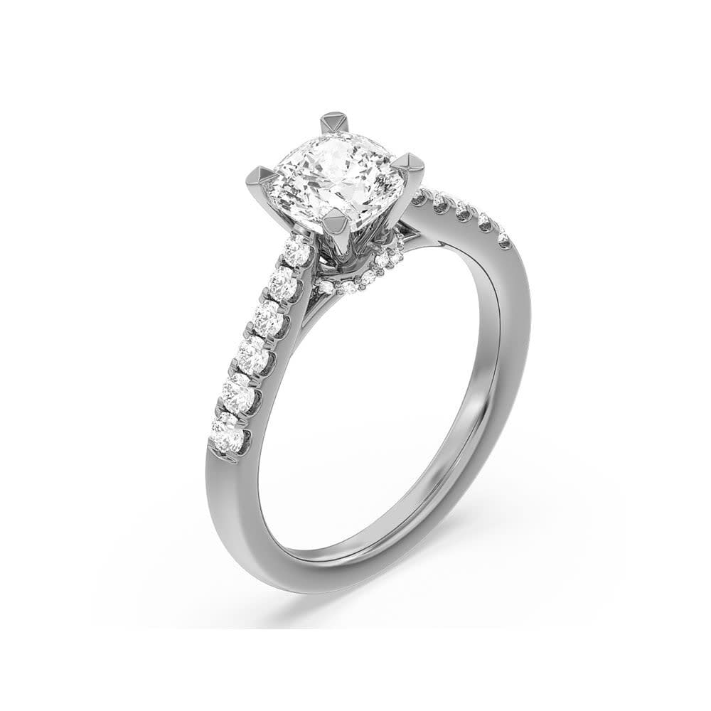 This women's engagement ring features a claw set cushion lab grown diamond at the centre.The band of the ring is adorned with diamonds that are set closely together using the pave setting technique. The combination of the Claw Set design and the pave set diamonds creates a ring that is both elegant and unique. All Temple and Grace jewellery is beautifully crafted to the highest standards and is made at our jewellery workshop directly by us (skilled jewellery craftsmen). This is why you can save over 40% when compared to high-street retail prices. We also offer a lifetime warranty and unmatched 100 day returns. You can shop online or book an appointment to visit our jewellery boutiques in Sydney, Melbourne, Brisbane and Perth.
