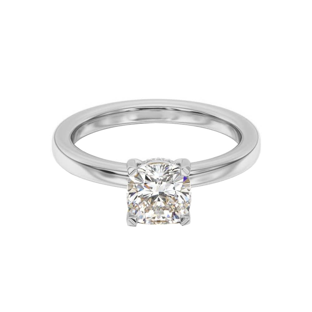 This engagement ring features a cushion shaped lab grown diamond and a subtle hidden halo, which is a row of smaller diamonds set underneath the centre stone. The diamond is set on a slim line band, giving the ring a modern and sleek appearance. The band features signature claw details, which securely hold the centre stone in place, adding a touch of uniqueness to the design. All Temple and Grace jewellery is beautifully crafted to the highest standards and is made at our jewellery workshop directly by us (skilled jewellery craftsmen). This is why you can save over 40% when compared to high-street retail prices. We also offer a lifetime warranty and unmatched 100 day returns. You can shop online or book an appointment to visit our jewellery boutiques in Sydney, Melbourne, Brisbane and Perth.