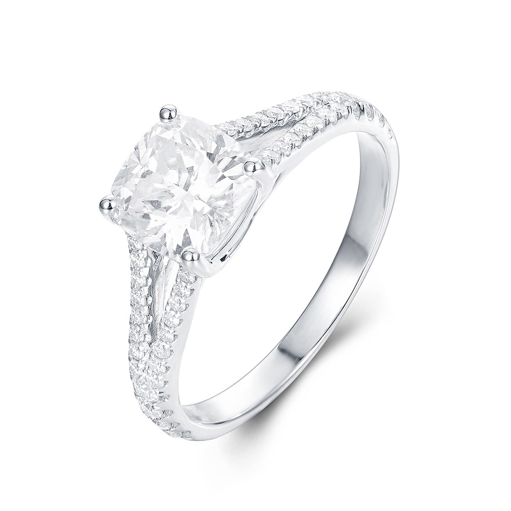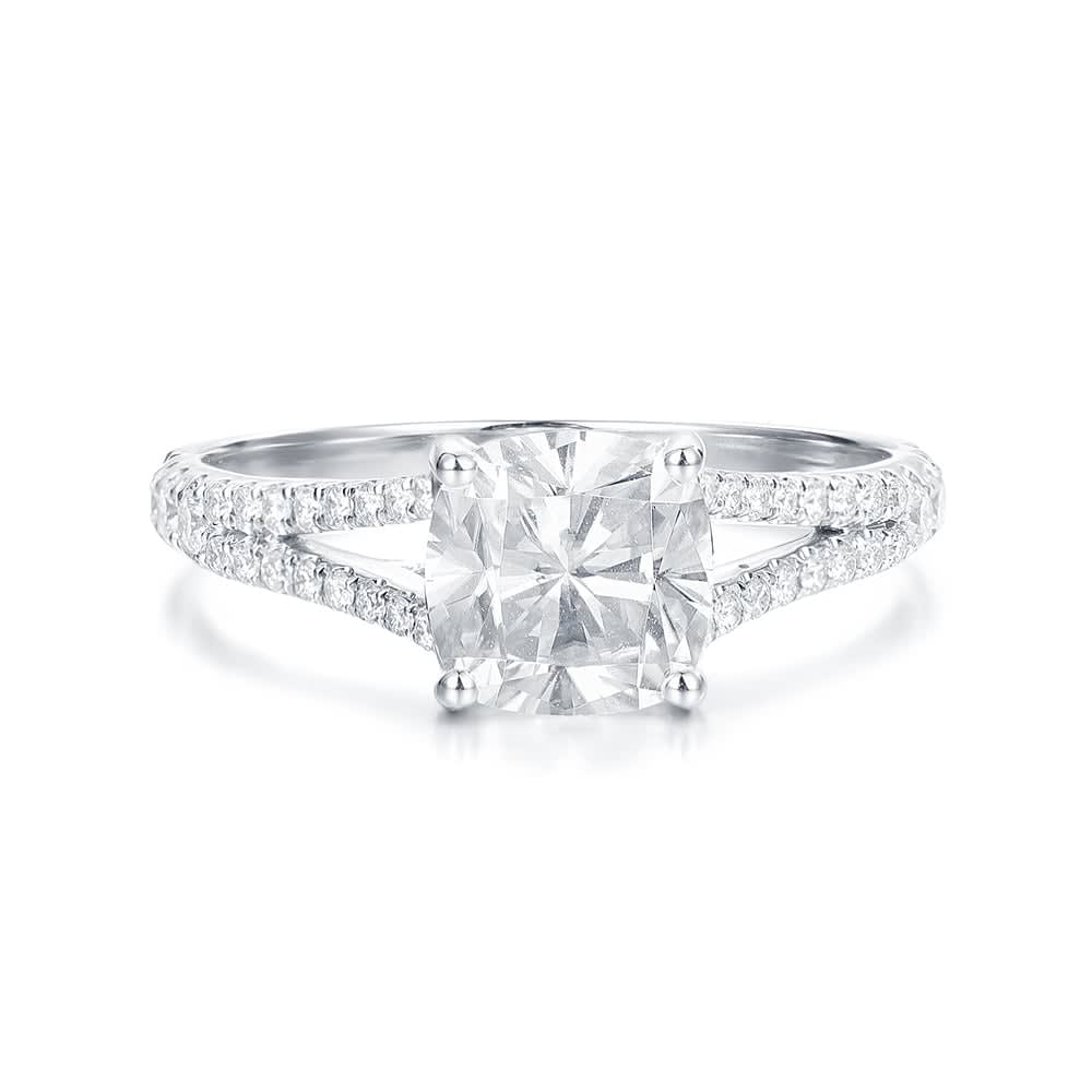 This stunning lab grown diamond engagement ring features a shimmering cushion cut diamond and round brilliant diamonds running the length of the split shank. This setting combines a distinctive design from the profile with the beauty of a split shank setting from the top. All Temple and Grace jewellery is beautifully crafted to the highest standards and is made at our jewellery workshop directly by us (skilled jewellery craftsmen). This is why you can save over 40% when compared to high-street retail prices. We also offer a lifetime warranty and unmatched 100 day returns. You can shop online or book an appointment to visit our jewellery boutiques in Sydney, Melbourne, Brisbane and Perth.
