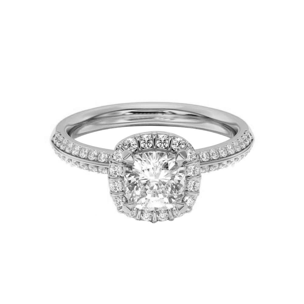 This classic women's engagement ring features a cushion cut diamond as it's centrepiece, surrounded by a halo of smaller round diamonds. The shank of the ring is a unique knife edge design, adding a contemporary touch to the classic halo style. The edges of the band are angled, creating a sleek and modern look that is sure to impress. Two additional marquise shaped diamonds are set underneath the centre stone, adding a touch of uniqueness to the overall design. All Temple and Grace jewellery is beautifully crafted to the highest standards and is made at our jewellery workshop directly by us (skilled jewellery craftsmen). This is why you can save over 40% when compared to high-street retail prices. We also offer a lifetime warranty and unmatched 100 day returns. You can shop online or book an appointment to visit our jewellery boutiques in Sydney, Melbourne, Brisbane and Perth.