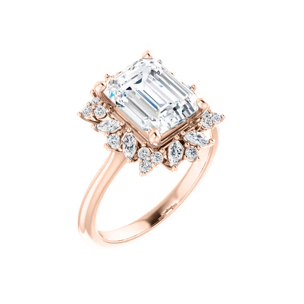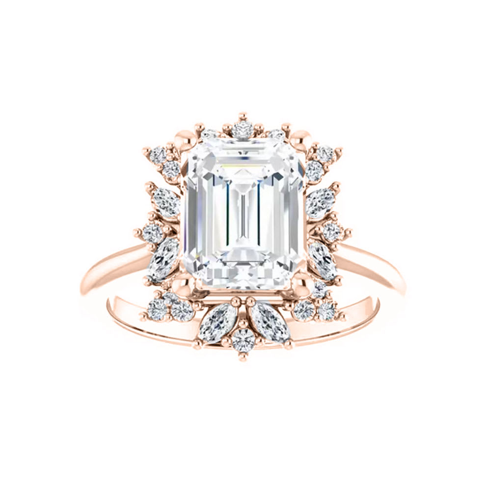 This women's engagement ring showcases an emerald shaped diamond as it's focal point. Surrounding the emerald shaped diamond is a stunning and artistic arrangement of marquise and round brilliant diamonds. The marquise diamonds, with their elegant and pointed oval shape, are positioned strategically to create a beautiful pattern that gracefully complements the central diamond. The polished finish adds a touch of refinement to the overall appearance of the ring, making it a joy to wear on any occasion. All Temple and Grace jewellery is beautifully crafted to the highest standards and is made at our jewellery workshop directly by us (skilled jewellery craftsmen). This is why you can save over 40% when compared to high-street retail prices. We also offer a lifetime warranty and unmatched 100 day returns. You can shop online or book an appointment to visit our jewellery boutiques in Sydney, Melbourne, Brisbane, Perth and Adelaide.