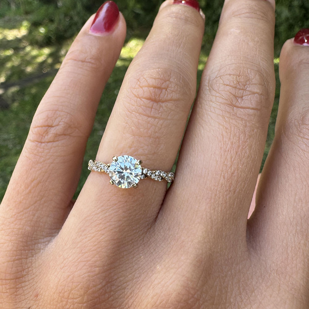 A unique solitaire diamond ring is perfect for women with a sophisticated sense of style. It displays a certified 1.00 carat gleaming round diamond mounted on a twisted shank encrusted with diamond accents forming an infinity pattern. This stunning engagement ring is a great way to celebrate your eternal bond. It is available in 18K white, yellow, rose gold, and platinum 950. The jewellery is beautifully handmade to the highest standards. Shop directly from us and save over 40% when compared to high-street retail prices. We also offer unmatched 100 day returns. Buy online or book an appointment to visit our jewellery boutiques in Sydney and Melbourne.