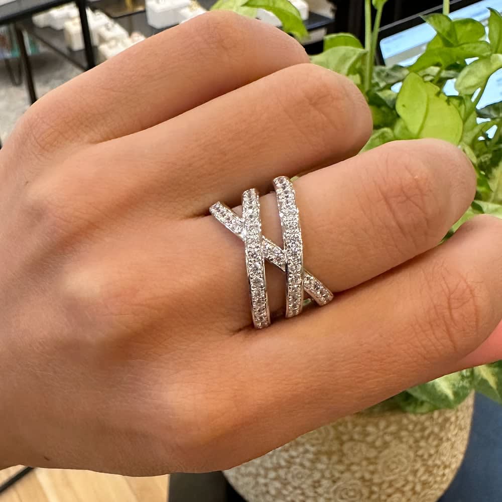 A treat to the eyes, the classic diamond cross-over pave ring offers a striking appeal. It features a double crisscross shank embellished with sparkling diamond accents. This piece of jewel looks unassumingly stylish and exquisite. The band is available in 18K white, yellow, rose gold, platinum 600, and platinum 950. The jewellery is beautifully handmade to the highest standards. Shop directly from us and save over 40% when compared to high-street retail prices. We also offer unmatched 100 day returns. Buy online or book an appointment to visit our jewellery boutiques in Sydney, Melbourne and Brisbane.