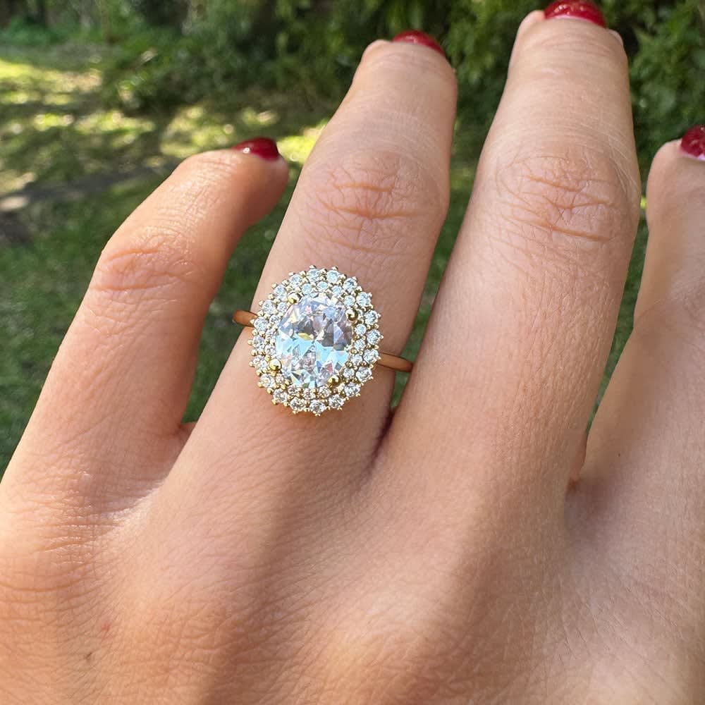 This women's engagement ring features a dazzling oval shaped diamond as it's centrepiece. It boasts dual halos of round brilliant diamonds encircling the focal stone. The dual halo design makes the ring truly stand out and gives it a luxurious and sophisticated look. All Temple and Grace jewellery is beautifully crafted to the highest standards and is made at our jewellery workshop directly by us (skilled jewellery craftsmen). This is why you can save over 40% when compared to high-street retail prices. We also offer a lifetime warranty and unmatched 100 day returns. You can shop online or book an appointment to visit our jewellery boutiques in Sydney, Melbourne, Brisbane, Perth and Adelaide.