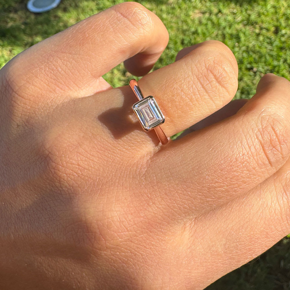 Modern minimalism meets timeless elegance in the East West Bezel Set Emerald Cut Engagement Ring. Featuring a striking emerald-cut diamond set horizontally ("East West") within a sleek bezel setting, this ring makes a bold yet refined statement. The clean lines of the rectangular stone are perfectly complemented by the warm tone of the rose gold band, creating a chic and contemporary silhouette ideal for those who appreciate understated sophistication. All Temple and Grace jewellery is beautifully crafted to the highest standards and is made at our jewellery workshop directly by us (skilled jewellery craftsmen). This is why you can save over 40% when compared to high-street retail prices. We also offer a lifetime warranty and unmatched 100 day returns. You can shop online or book an appointment to visit our jewellery boutiques in Sydney, Melbourne, Brisbane, Perth and Adelaide.