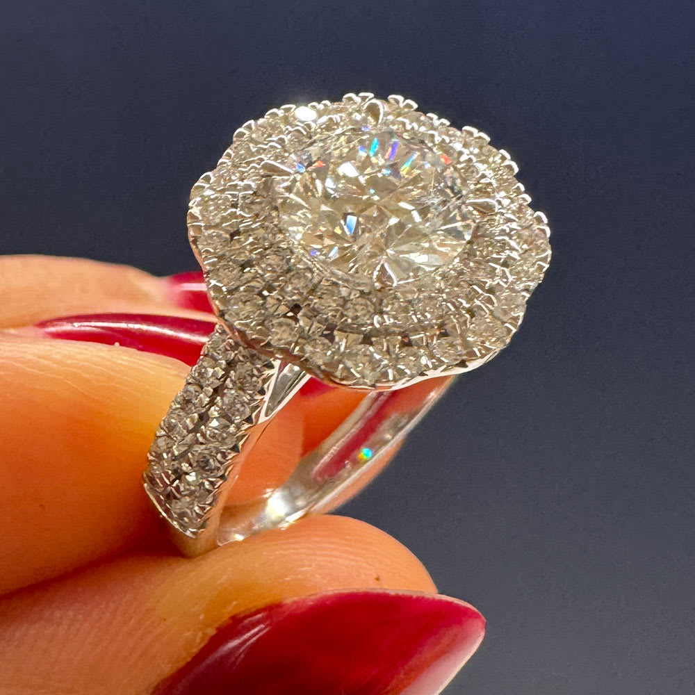 This engagement ring for women's features a lab grown round brilliant diamond that sits elegantly in the centre. It is surrounded by two halos of smaller diamonds that are set in pave style, giving the ring a beautiful floral appearance. It's shanks are also adorned with stones, which are set in two lines that run parallel to each other creating a captivating contrast to the central stone and uplift it. It is perfect for any woman who appreciates the finer things in life. All Temple and Grace jewellery is beautifully crafted to the highest standards and is made at our jewellery workshop directly by us (skilled jewellery craftsmen). This is why you can save over 40% when compared to high-street retail prices. We also offer a lifetime warranty and unmatched 100 day returns. You can shop online or book an appointment to visit our jewellery boutiques in Sydney, Melbourne, Brisbane and Perth.