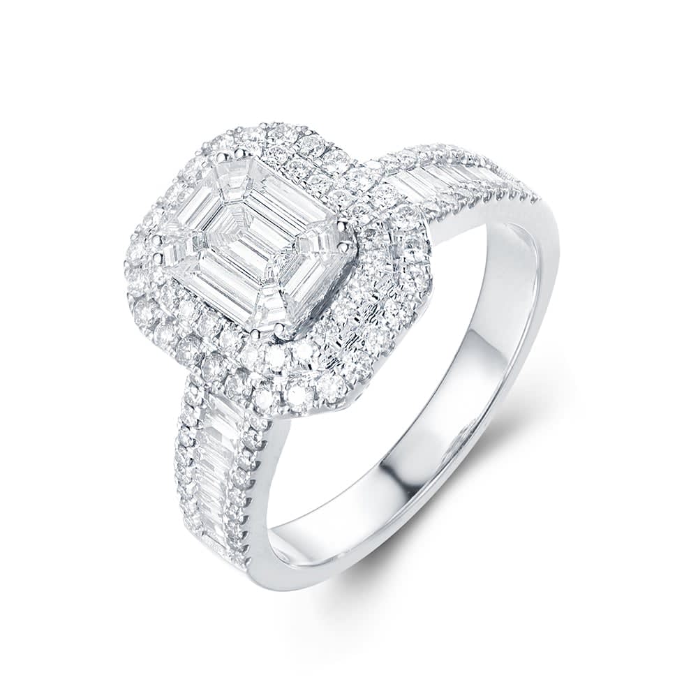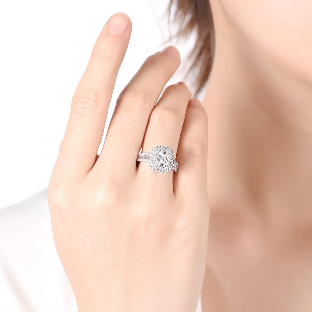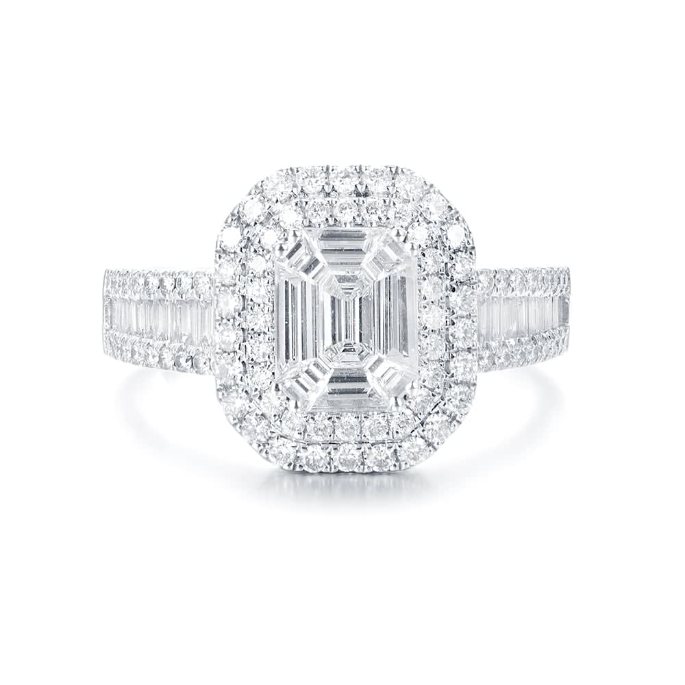 An absolutely show-stopping design, this stunning diamond cluster ring fully embraces the trend for vintage-inspired style. This breathtaking ring features a central cluster of elegant emerald and brilliant cut diamonds which are surrounded a halo of smaller diamonds to create a striking rectangular shape. All rings are available in Platinum, 18K White, Yellow, and Rose Gold. Please contact Temple and Grace team to learn more about this ring or to request pricing on something specific you may have in mind. This beautiful diamond ring can be converted to a diamond pendant. This stunning ring can be worn as a beautiful diamond pendant.