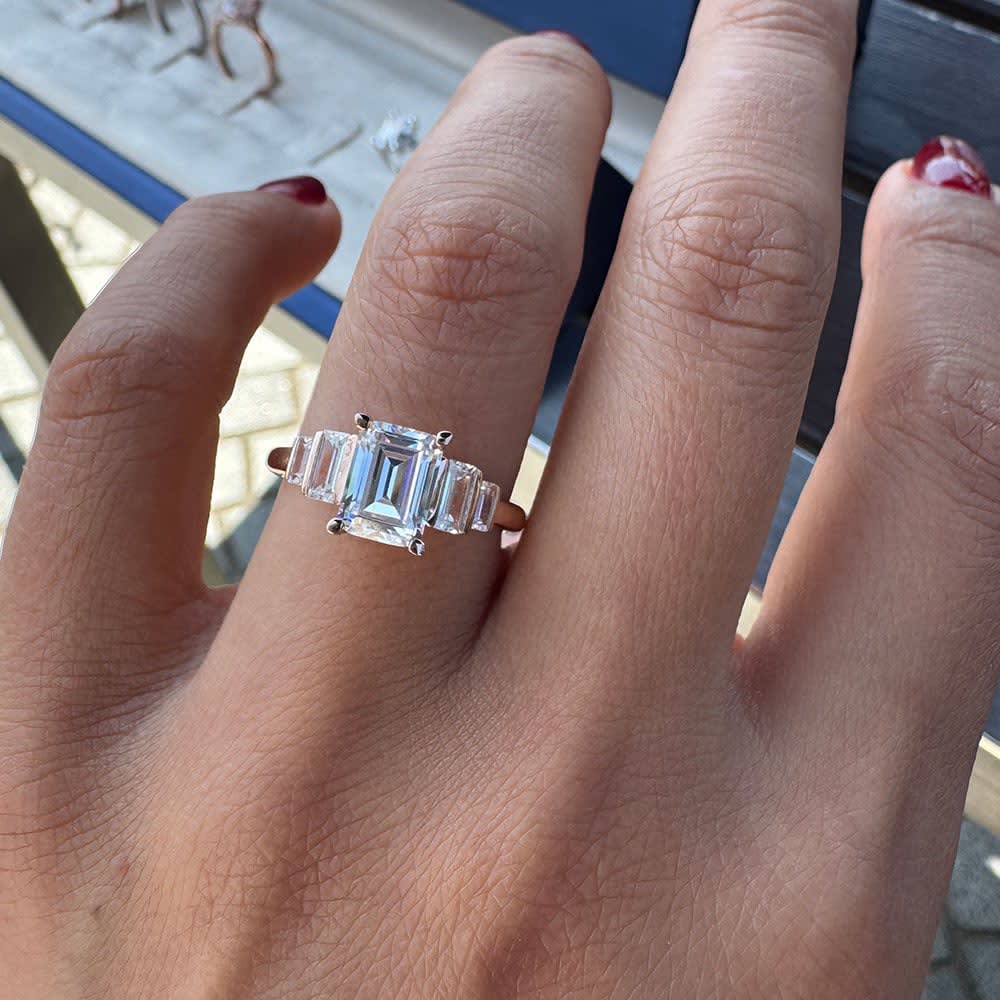 This women's engagement ring features a large emerald cut lab diamond at the centre that sparkles with brilliant light and catches the eye immediately. The centre stone is flanked on either side by angular side stones from the step cut family. These side stones complement the emerald cut diamond perfectly, adding to the ring's overall beauty. The sleek sophistication of this ring is what gives it a unique individuality. All Temple and Grace jewellery is beautifully crafted to the highest standards and is made at our jewellery workshop directly by us (skilled jewellery craftsmen). This is why you can save over 40% when compared to high-street retail prices. We also offer a lifetime warranty and unmatched 100 day returns. You can shop online or book an appointment to visit our jewellery boutiques in Sydney, Melbourne, Brisbane and Perth.