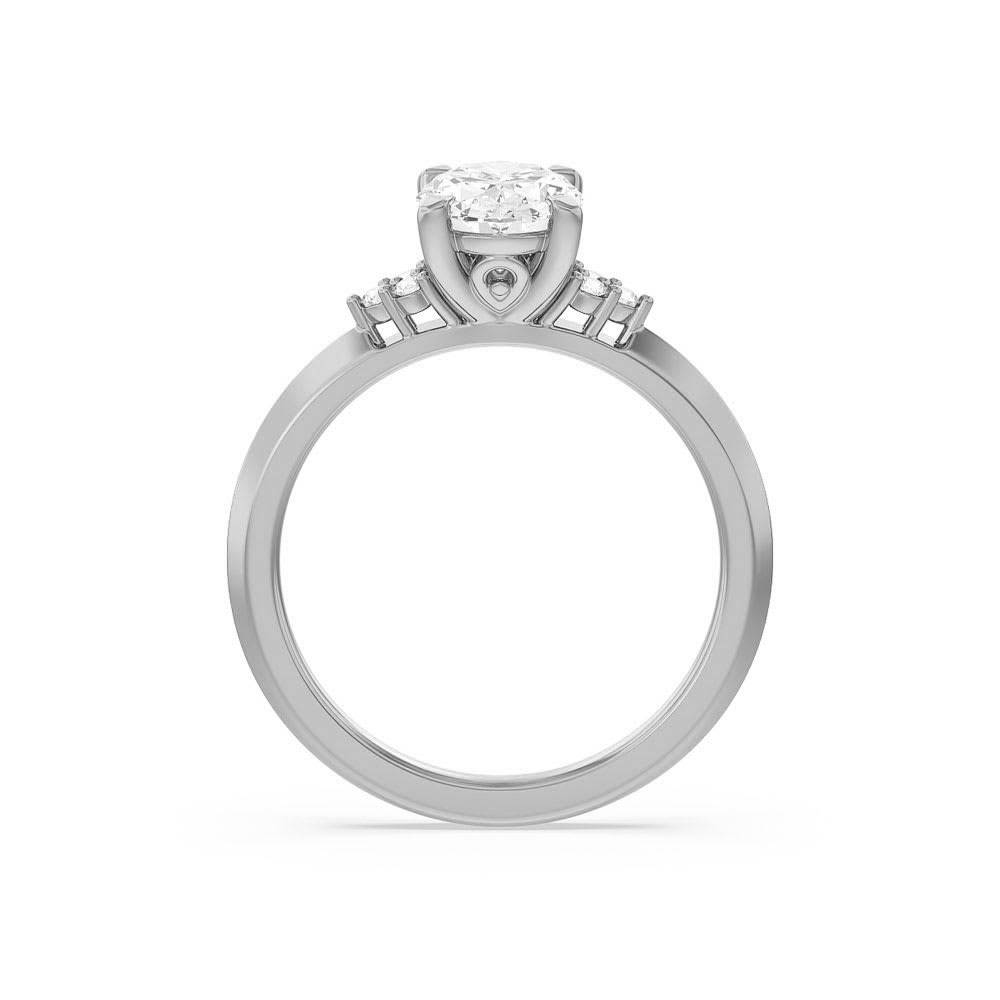 This women's engagement ring features a four prong setting for an oval shaped natural diamond. On it's shoulders, it has three spherical stones arranged in a triangular pattern. These stones are carefully chosen to compliment the core diamond and provide a touch of sophistication and elegance to the set. It boasts rounded, polished edges that give it a sleek, contemporary appearance. All Temple and Grace jewellery is beautifully crafted to the highest standards and is made at our jewellery workshop directly by us (skilled jewellery craftsmen). This is why you can save over 40% when compared to high-street retail prices. We also offer a lifetime warranty and unmatched 100 day returns. You can shop online or book an appointment to visit our jewellery boutiques in Sydney, Melbourne, Brisbane and Perth.