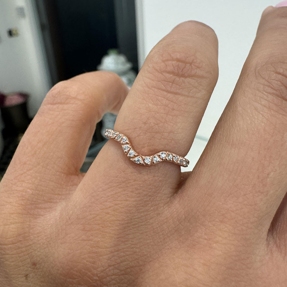 This women's wedding ring is a unique and stylish choice for someone who loves originality and elegance. It features a beautiful carved pattern that is further enhanced by glittering tiny diamonds accented throughout, creating a captivating and eye catching design. It's round, polished edges provide a comfortable fit, making it easy to wear. It is the perfect symbol of love and commitment. All Temple and Grace jewellery is beautifully crafted to the highest standards and is made at our jewellery workshop directly by us (skilled jewellery craftsmen). This is why you can save over 40% when compared to high-street retail prices. We also offer a lifetime warranty and unmatched 100 day returns. You can shop online or book an appointment to visit our jewellery boutiques in Sydney, Melbourne, Brisbane and Perth.