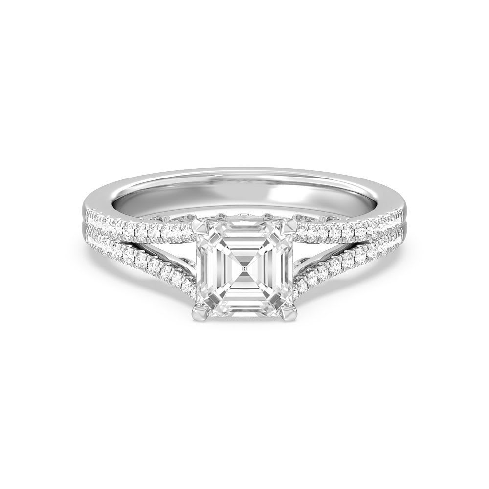 This women's engagement ring features a lab grown asscher diamond as it's focal point, which is set in a strong and secure four prong setting. It's split shanks are in pave setting with glittering diamonds. The diamonds are carefully set in the band and continue up to the stone, creating a seamless and cohesive design. It's scroll gallery has an intricate and subtle detail that adds to the overall beauty of it. A hidden diamond is set within the scroll gallery, which adds a touch of surprise and delight to the ring's design. All Temple and Grace jewellery is beautifully crafted to the highest standards and is made at our jewellery workshop directly by us (skilled jewellery craftsmen). This is why you can save over 40% when compared to high-street retail prices. We also offer a lifetime warranty and unmatched 100 day returns. You can shop online or book an appointment to visit our jewellery boutiques in Sydney, Melbourne, Brisbane and Perth.
