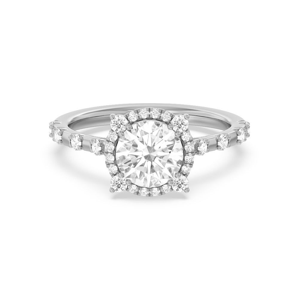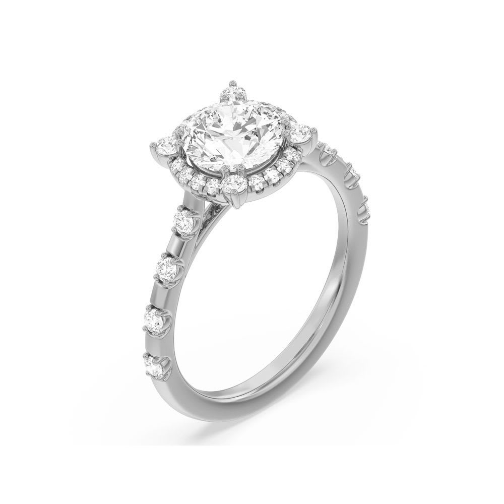 This stunning women's engagement ring showcases a gorgeous lab grown round shaped diamond, expertly set in a strong four prong setting. The central stone is highlighted by a halo of small, gleaming diamonds that add a touch of sophistication and glamour to it. On either side of central stone ,it's shanks are adorned with four diamonds, spaced elegantly half of the way around the band. All Temple and Grace jewellery is beautifully crafted to the highest standards and is made at our jewellery workshop directly by us (skilled jewellery craftsmen). This is why you can save over 40% when compared to high-street retail prices. We also offer a lifetime warranty and unmatched 100 day returns. You can shop online or book an appointment to visit our jewellery boutiques in Sydney, Melbourne, Brisbane and Perth.