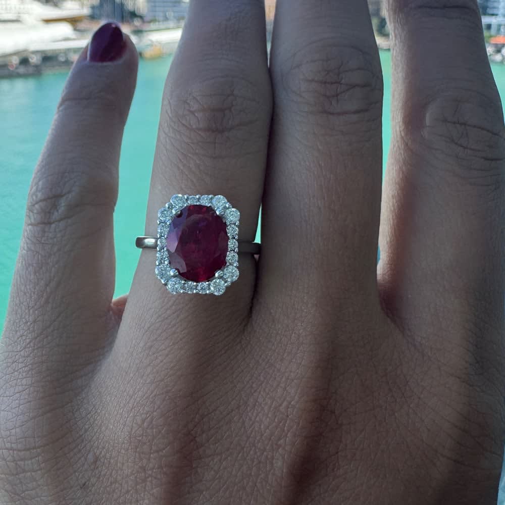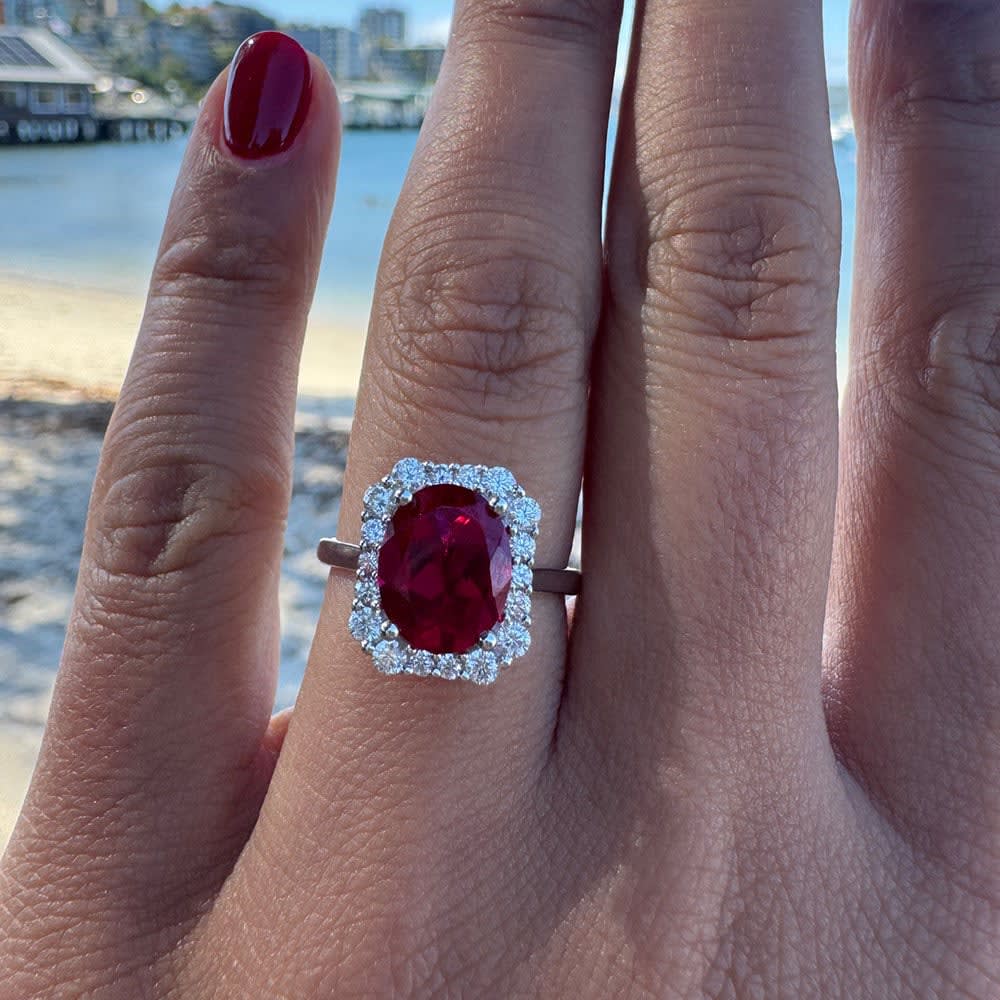 A striking vision of romance and sophistication, this ring draws the eye with its vivid oval-cut ruby vibrant, rich, and full of life. The ruby glows with a deep red intensity, evoking timeless passion and grace. Accenting the centerpiece are sparkling diamonds that halo and flank the ruby, adding flashes of brilliance that catch the light from every angle. The design blends classic elegance with modern clarity: the smooth contours guide the gaze to the center stone, while the diamonds’ subtle fire adds depth and dimension. All Temple and Grace jewellery is beautifully crafted to the highest standards and is made at our jewellery workshop directly by us (skilled jewellery craftsmen). This is why you can save over 40% when compared to high-street retail prices. We also offer a lifetime warranty and unmatched 100 day returns. You can shop online or book an appointment to visit our jewellery boutiques in Sydney, Melbourne, Brisbane, Perth and Adelaide.