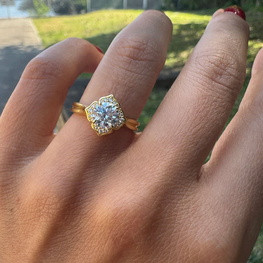 This women's engagement ring features a stunning lab grown round brilliant diamond as it's centrepiece. The focal diamond is surrounded by a halo of diamonds in a petal shape, which adds to the ring's elegance and sparkle. The engraved split detail creates a separation between the top and bottom of the band, making the ring more visually interesting. All Temple and Grace jewellery is beautifully crafted to the highest standards and is made at our jewellery workshop directly by us (skilled jewellery craftsmen). This is why you can save over 40% when compared to high-street retail prices. We also offer a lifetime warranty and unmatched 100 day returns. You can shop online or book an appointment to visit our jewellery boutiques in Sydney, Melbourne, Brisbane and Perth.