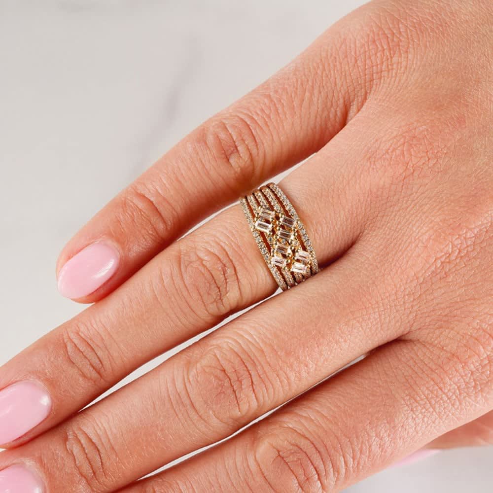 A strikingly unique design, this 18ct gold diamond ring will catch everyone’s eye for its effortless sparkle. Five rows of round brilliant diamonds glisten brilliantly against the 18ct gold band, and with each baguette-cut diamond held in four claw setting, the finish is truly dazzling.Choose this eternal ring in 18K white gold, yellow gold, rose gold and platinum. All Temple and Grace jewellery is beautifully crafted to the highest standards and is made at our jewellery workshop directly by us (skilled jewellery craftsmen). This is why you can save over 40% when compared to high-street retail prices. We also offer a lifetime warranty and unmatched 100 day returns. You can shop online or book an appointment to visit our jewellery boutiques in Sydney, Melbourne, Brisbane, Perth and Adelaide.