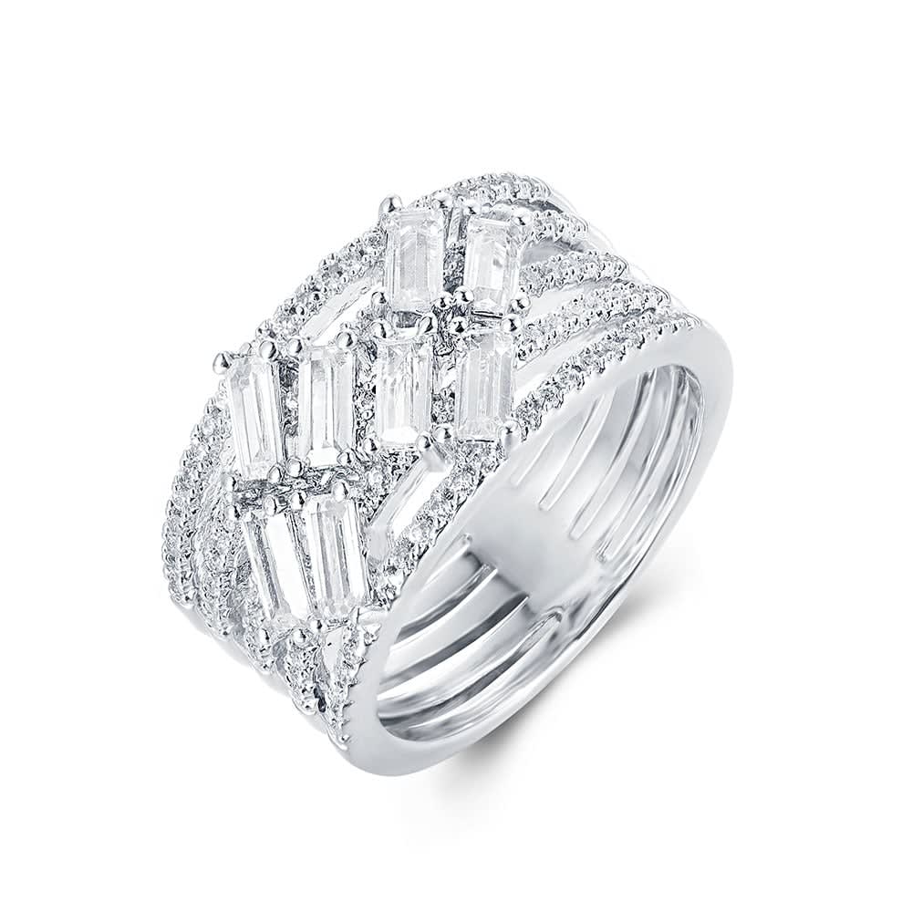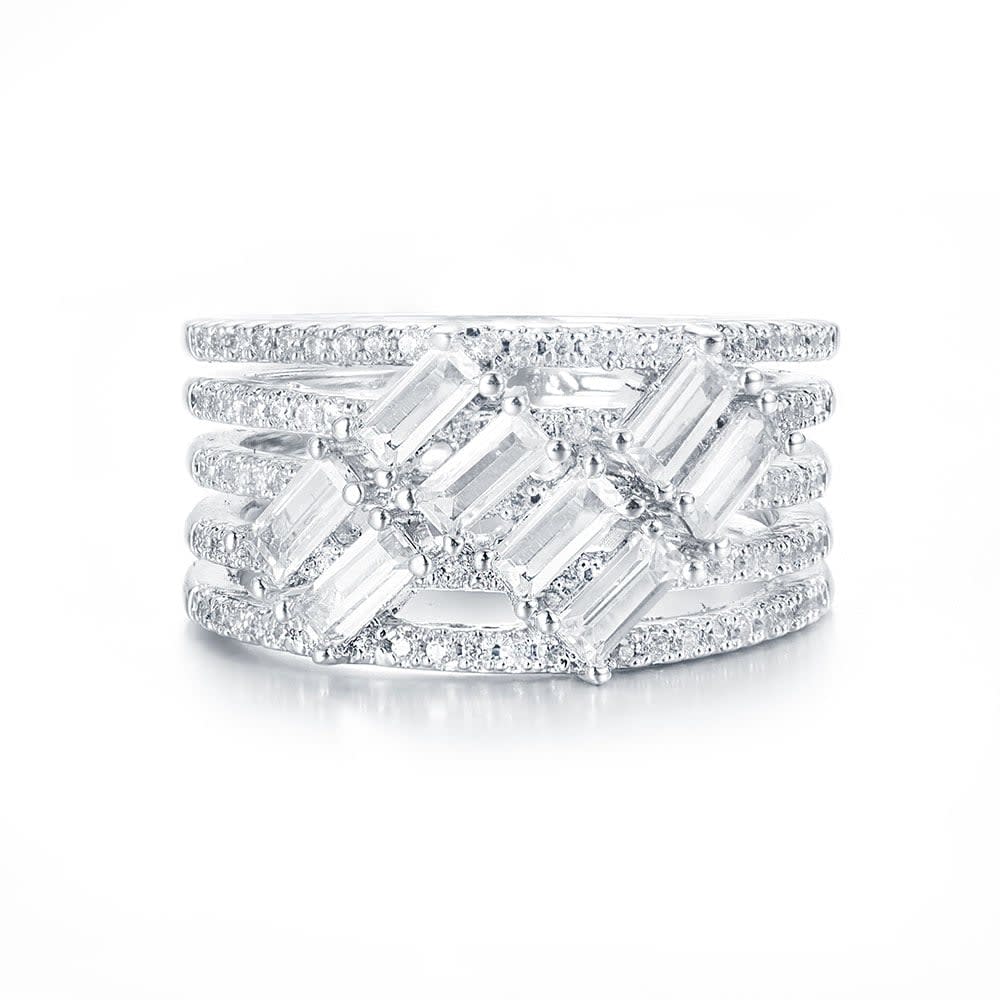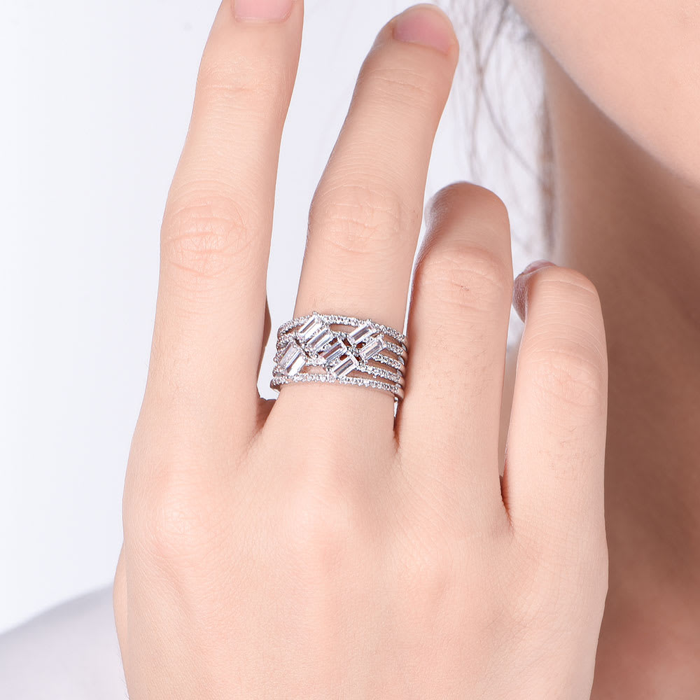A strikingly unique design, this 18ct gold diamond ring will catch everyone’s eye for its effortless sparkle. Five rows of round brilliant diamonds glisten brilliantly against the 18ct gold band, and with each baguette-cut diamond held in four claw setting, the finish is truly dazzling.Choose this eternal ring in 18K white gold, yellow gold, rose gold and platinum. All Temple and Grace jewellery is beautifully crafted to the highest standards and is made at our jewellery workshop directly by us (skilled jewellery craftsmen). This is why you can save over 40% when compared to high-street retail prices. We also offer a lifetime warranty and unmatched 100 day returns. You can shop online or book an appointment to visit our jewellery boutiques in Sydney, Melbourne, Brisbane, Perth and Adelaide.