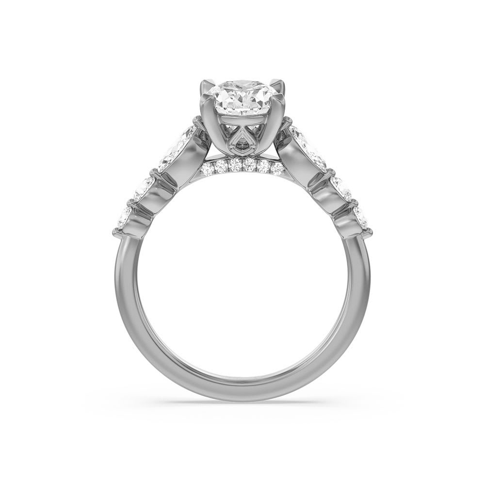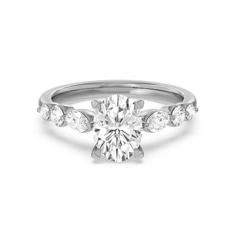 This classic women's engagement ring features an oval shaped shimmering lab diamond, framed by a set of fancy side stones that add to the ring's overall glamour and sparkle. The bridge of the ring is also adorned with small diamonds, which add even more glitter. Combination of marquise and round diamonds blends well as side stones. All Temple and Grace jewellery is beautifully crafted to the highest standards and is made at our jewellery workshop directly by us (skilled jewellery craftsmen). This is why you can save over 40% when compared to high-street retail prices. We also offer a lifetime warranty and unmatched 100 day returns. You can shop online or book an appointment to visit our jewellery boutiques in Sydney, Melbourne, Brisbane and Perth.