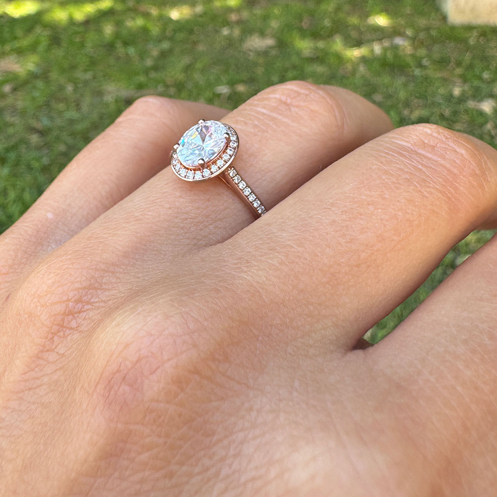 This Oval Brilliant Cut engagement ring with a diamond halo is set with a 1.70ct Certified oval brilliant cut diamond in the center with other diamonds forming a halo and diamonds halfway across the band. This ring style can be made to accommodate a center stone of any size/quality to meet your desired budget. All rings are available in Platinum, 18K White, Yellow, and Rose Gold. Temple and Grace are the only Australian jewellery store to offer a 100% peace-of-mind guarantee. It's simple, you either love your new diamond ring or get your money back. Need it customized? Call us for a no-obligation quote. Being Sydney based jewellery designers and makers means that we can offer you incredible value for your money. When you buy your jewellery directly from us, you cut out on the expensive high-street stores and save up to 40% on your jewellery.