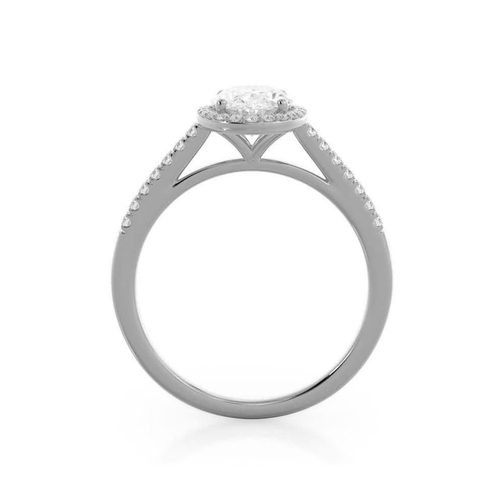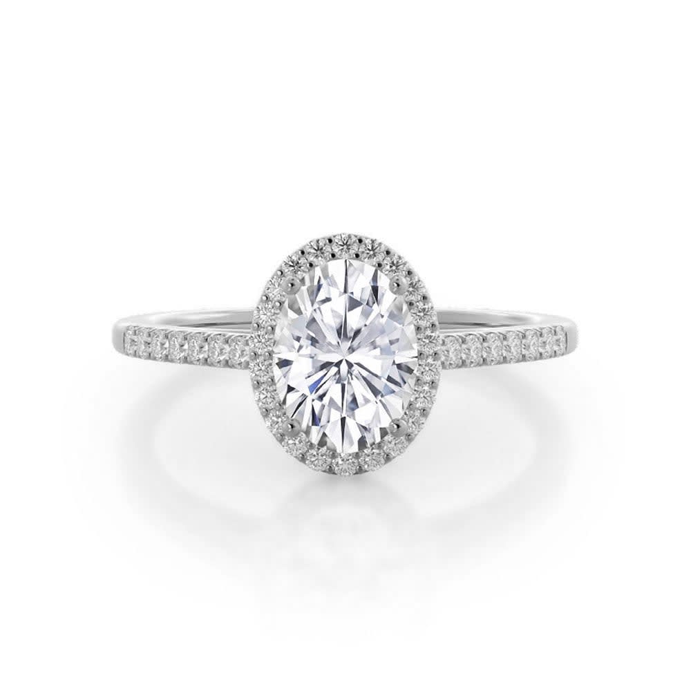 This women engagement ring features a beautiful oval lab grown diamond at its centre, which is surrounded by a round brilliant cut lab grown diamonds. The round diamonds are set closely together, creating a continuous and seamless line of sparkle. The band of the ring is adorned with round diamonds set halfway around, adding an extra touch of shimmer and shine to the overall design. All Temple and Grace jewellery is beautifully crafted to the highest standards and is made at our jewellery workshop directly by us (skilled jewellery craftsmen). This is why you can save over 40% when compared to high-street retail prices. We also offer a lifetime warranty and unmatched 100 day returns. You can shop online or book an appointment to visit our jewellery boutiques in Sydney, Melbourne, Brisbane and Perth.