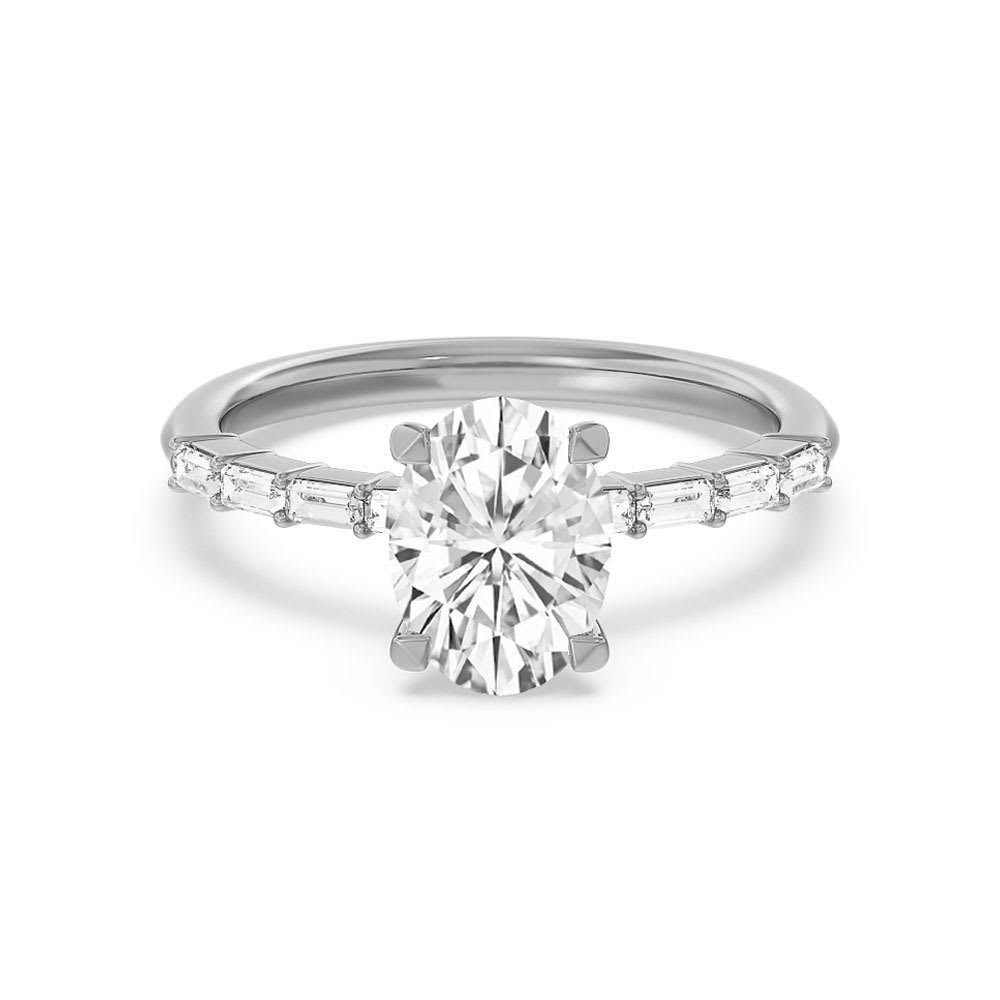 This engagement ring for women features an oval shaped lab diamond as it's centrepiece. Halfway along the band, there are baguette cut lab diamonds that serve as beautiful accents to the focal stone. It is a beautiful and unique choice for someone looking for a classic and timeless design with modern accents. All Temple and Grace jewellery is beautifully crafted to the highest standards and is made at our jewellery workshop directly by us (skilled jewellery craftsmen). This is why you can save over 40% when compared to high-street retail prices. We also offer a lifetime warranty and unmatched 100 day returns. You can shop online or book an appointment to visit our jewellery boutiques in Sydney, Melbourne, Brisbane and Perth.