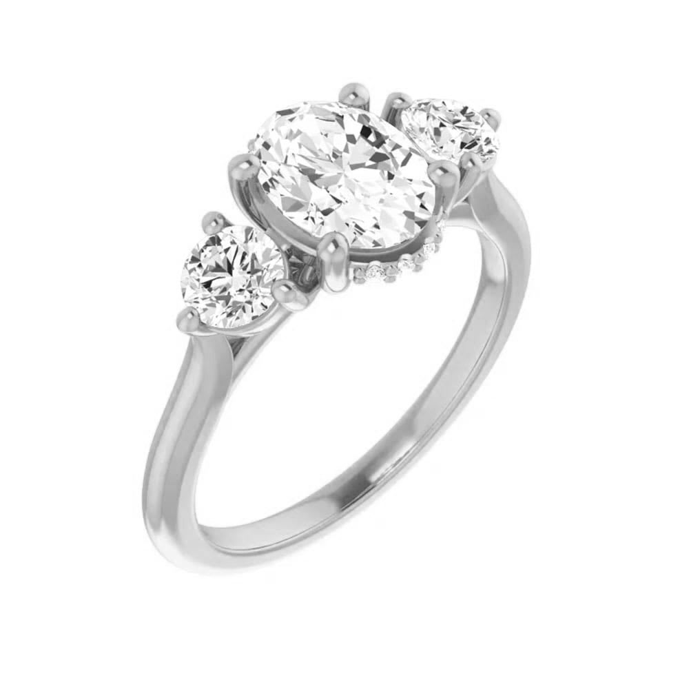 This women's engagement ring showcases a stunning oval shaped diamond as it's focal point. Below the central diamond, the band is adorned with tiny diamonds that add a delicate and subtle touch of brilliance. On either side of the diamond, it features brilliant round diamonds, which complement the oval shape and add to the ring's overall radiance. All Temple and Grace jewellery is beautifully crafted to the highest standards and is made at our jewellery workshop directly by us (skilled jewellery craftsmen). This is why you can save over 40% when compared to high-street retail prices. We also offer a lifetime warranty and unmatched 100 day returns. You can shop online or book an appointment to visit our jewellery boutiques in Sydney, Melbourne, Brisbane, Perth and Adelaide.