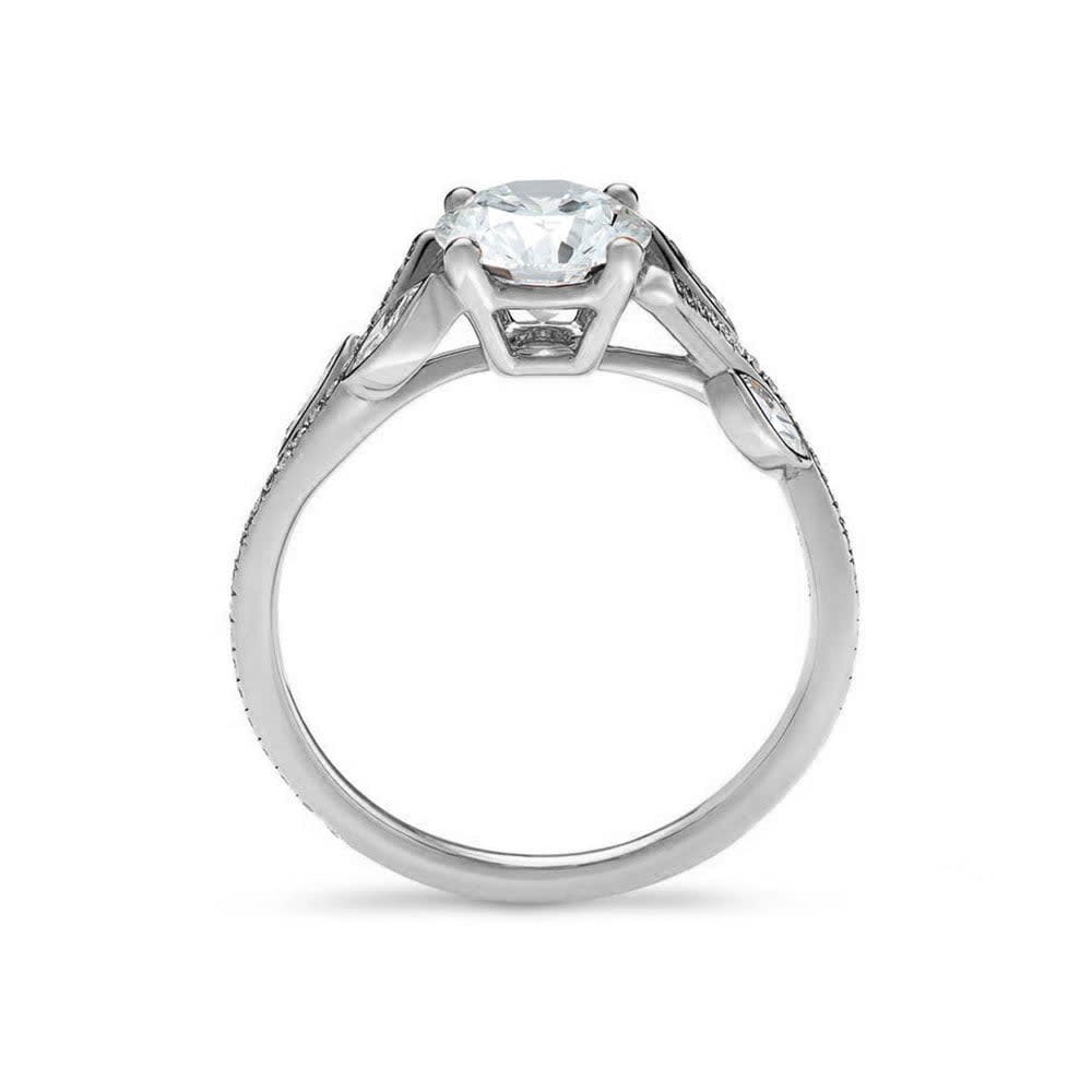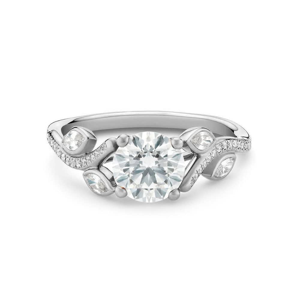 The stunning nature-inspired ring depicts an image of leaves entwined around a stem. It features a 0.90ct round brilliant cut diamond held in a claw setting adorned with bezel set marquise and pave set round diamonds on the shoulders. This gorgeous engagement ring draws attention with its unique and rich pattern. It is available in 18K white, yellow, rose gold, and platinum 950. The jewellery is beautifully handmade to the highest standards. Shop directly from us and save over 40% when compared to high-street retail prices. We also offer unmatched 100 day returns. Buy online or book an appointment to visit our jewellery boutiques in Sydney and Melbourne.