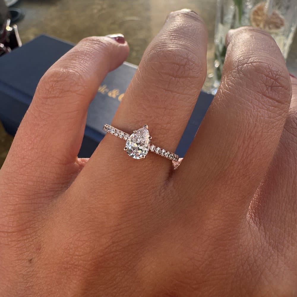 A Pear cut diamond engagement ring is one of the popular cuts for engagement rings, and for good reason! It sparkles like none other. The classic solitaire setting highlights the diamond and gives you options to play with different styles of wedding bands. This gorgeous diamond engagement ring is set with 0.70ct Certified diamond in a four claw setting on a beautifully crafted on a diamond band. This ring style can be customized to your choice of diamonds of any size and quality to meet your desired budget. All rings are available in Platinum, 18K White, Yellow, and Rose Gold. Please contact Temple and Grace team to learn more about this ring or to request pricing on something specific you may have in mind.