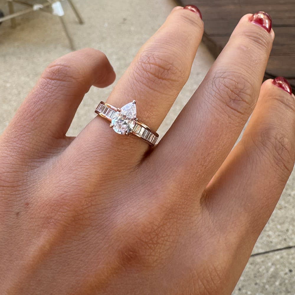 A striking pear diamond engagement ring radiates an undeniable sophistication. It showcases a GIA certified 0.60 carat pear diamond encrusted on a channel set diamond shank. The baguette-cut diamonds on the shoulders accentuate the beauty of this gorgeous band and exude a dramatic brilliance. It is available in 18K white, yellow, rose gold, and platinum 950. The jewellery is beautifully handmade to the highest standards. Shop directly from us and save over 40% when compared to high-street retail prices. We also offer unmatched 100 day returns. Buy online or book an appointment to visit our jewellery boutiques in Sydney and Melbourne.