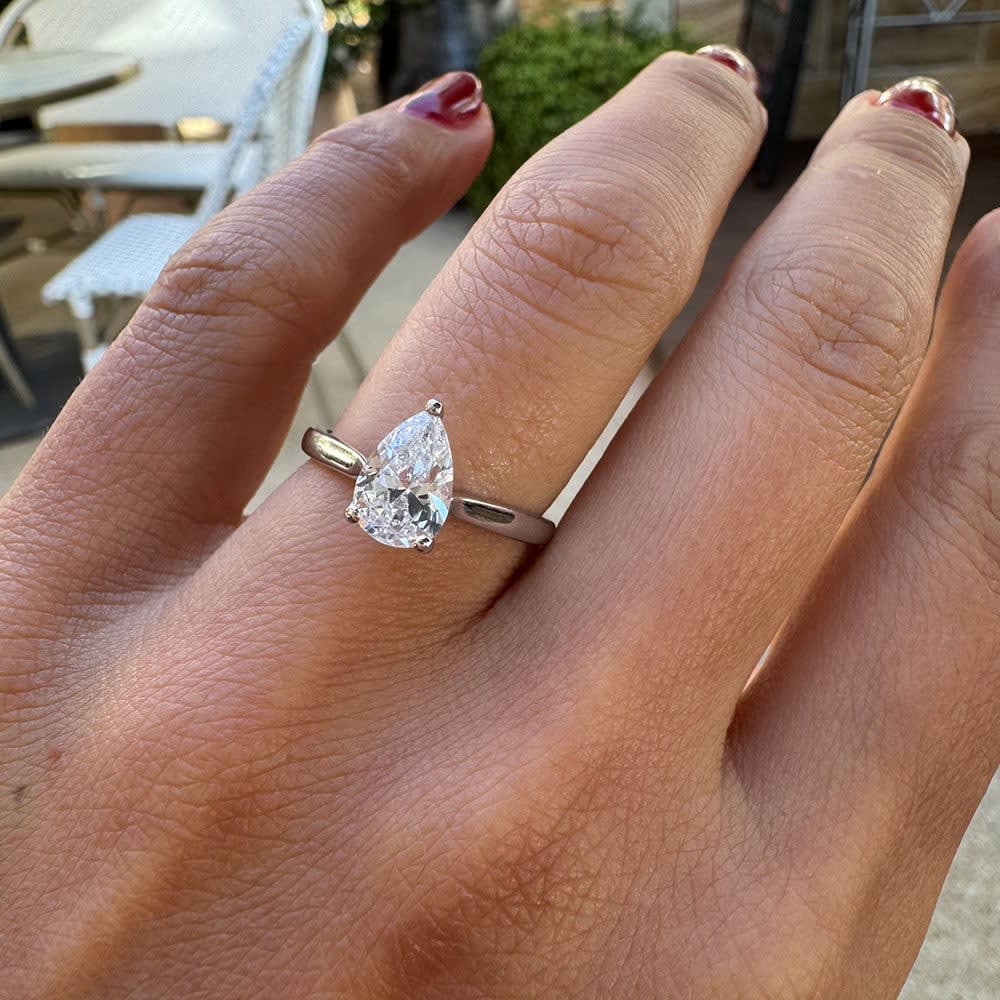 Simple and classic, this diamond engagement pave ring evokes a sense of timeless elegance. The highly polished band gently tapers to the centre GIA certified 0.60 carat pear-shaped diamond held in a claw setting. A row of pave set diamond accents beneath the pear diamond accentuates the beauty of this gorgeous band. This ring is available in 18K white, yellow, rose gold, and platinum 950. The jewellery is beautifully handmade to the highest standards. Shop directly from us and save over 40% when compared to high-street retail prices. We also offer unmatched 100 day returns. Buy online or book an appointment to visit our jewellery boutiques in Sydney and Melbourne.