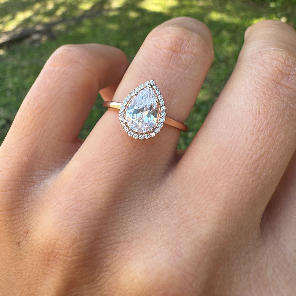 This women's engagement ring showcases a dazzling pear shaped diamond as it's focal point, making it a truly captivating and unique piece. To further elevate the beauty of the central diamond, it features a halo of tiny round diamonds encircling the centre stone. It's polished shanks add a touch of practicality, making it a perfect blend of beauty and comfort. All Temple and Grace jewellery is beautifully crafted to the highest standards and is made at our jewellery workshop directly by us (skilled jewellery craftsmen). This is why you can save over 40% when compared to high-street retail prices. We also offer a lifetime warranty and unmatched 100 day returns. You can shop online or book an appointment to visit our jewellery boutiques in Sydney, Melbourne, Brisbane, Perth and Adelaide.