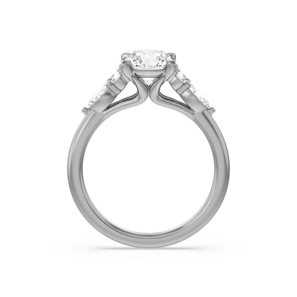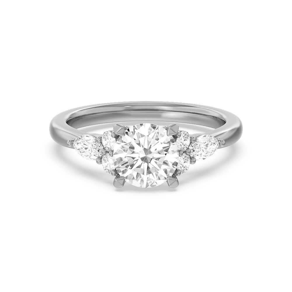 This women's engagement ring features a round lab grown diamond at the centre, which is flanked by a trio of clusters of diamond side stones. The round and marquise shaped lab grown diamonds are added for the overall brilliance and beauty of the ring. All Temple and Grace jewellery is beautifully crafted to the highest standards and is made at our jewellery workshop directly by us (skilled jewellery craftsmen). This is why you can save over 40% when compared to high-street retail prices. We also offer a lifetime warranty and unmatched 100 day returns. You can shop online or book an appointment to visit our jewellery boutiques in Sydney, Melbourne, Brisbane and Perth.