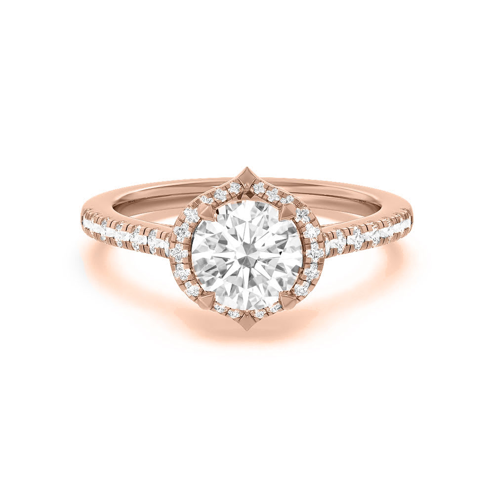 This women's engagement ring features a gleaming natural round diamond at it's centre. The stone is surrounded by a halo of glittering small diamonds, which accentuate the beauty and brilliance of the focal stone. The band is adorned with half accented diamonds on either side which uplift the focal stone and adds elegance and sparkle to the ring. All Temple and Grace jewellery is beautifully crafted to the highest standards and is made at our jewellery workshop directly by us (skilled jewellery craftsmen). This is why you can save over 40% when compared to high-street retail prices. We also offer a lifetime warranty and unmatched 100 day returns. You can shop online or book an appointment to visit our jewellery boutiques in Sydney, Melbourne, Brisbane and Perth.