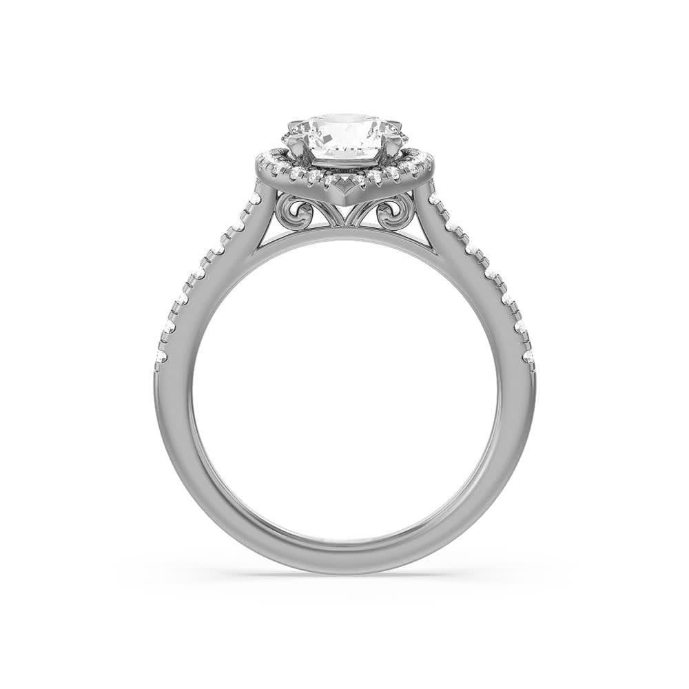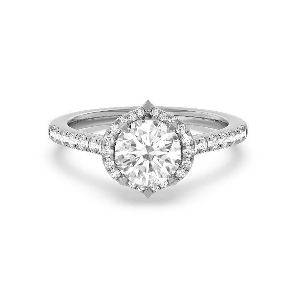 This women's engagement ring features a gleaming natural round diamond at it's centre. The stone is surrounded by a halo of glittering small diamonds, which accentuate the beauty and brilliance of the focal stone. The band is adorned with half accented diamonds on either side which uplift the focal stone and adds elegance and sparkle to the ring. All Temple and Grace jewellery is beautifully crafted to the highest standards and is made at our jewellery workshop directly by us (skilled jewellery craftsmen). This is why you can save over 40% when compared to high-street retail prices. We also offer a lifetime warranty and unmatched 100 day returns. You can shop online or book an appointment to visit our jewellery boutiques in Sydney, Melbourne, Brisbane and Perth.