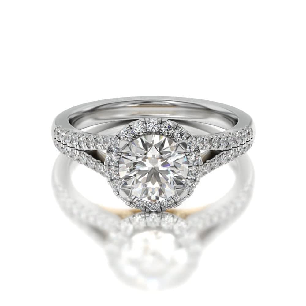 This women's engagement ring features a round lab diamond that is encased in a halo of round diamonds. The band is split into two separate strands that curve around the centre stone. The strands are studded with small diamonds, which would add to the ring's overall sparkle. All Temple and Grace jewellery is beautifully crafted to the highest standards and is made at our jewellery workshop directly by us (skilled jewellery craftsmen). This is why you can save over 40% when compared to high-street retail prices. We also offer a lifetime warranty and unmatched 100 day returns. You can shop online or book an appointment to visit our jewellery boutiques in Sydney, Melbourne, Brisbane and Perth.