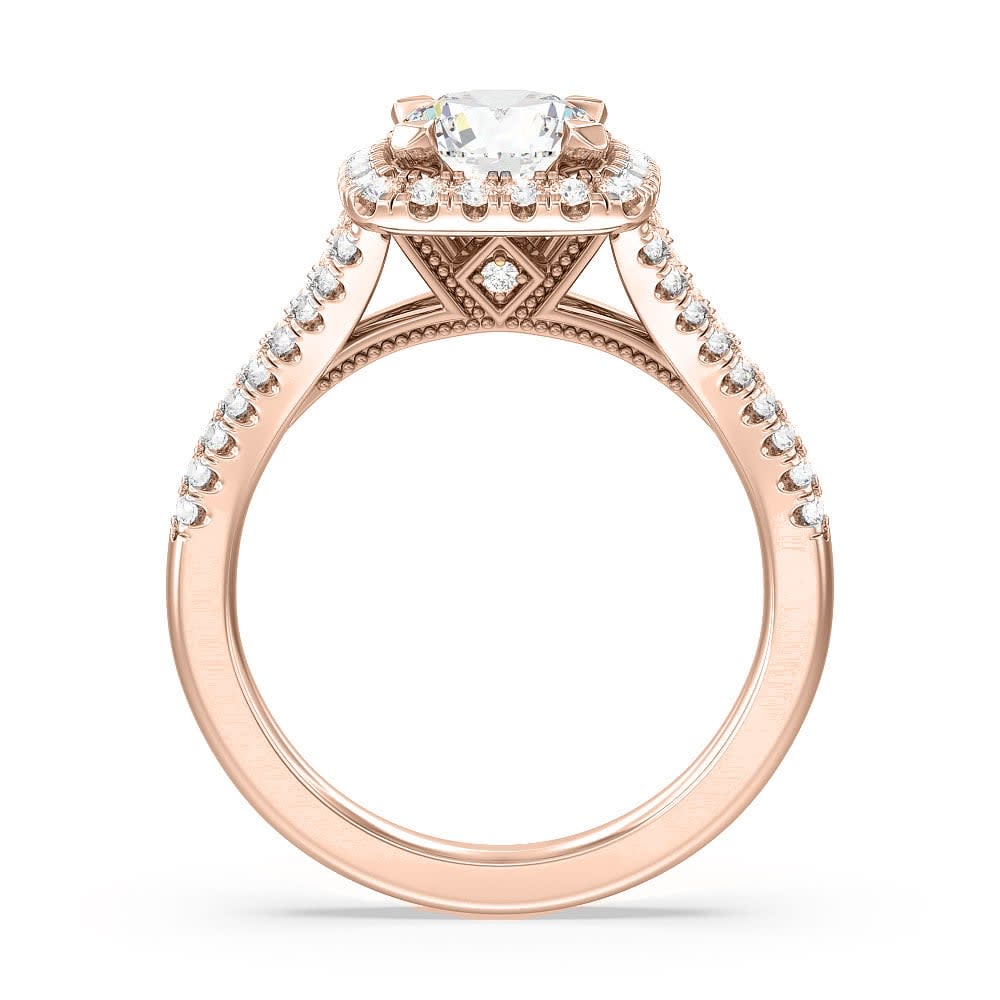 This women's engagement ring features a lab grown round brilliant diamond as it's centrepiece which is enhanced by a halo of glittering stones. The shanks of the ring are accented with diamonds that uplift the central diamond, creating a stunning and elegant look. It has hidden diamond along with milgrain detailing ,which has delicate and intricate design that adds a vintage touch to the ring. All Temple and Grace jewellery is beautifully crafted to the highest standards and is made at our jewellery workshop directly by us (skilled jewellery craftsmen). This is why you can save over 40% when compared to high-street retail prices. We also offer a lifetime warranty and unmatched 100 day returns. You can shop online or book an appointment to visit our jewellery boutiques in Sydney, Melbourne, Brisbane and Perth.
