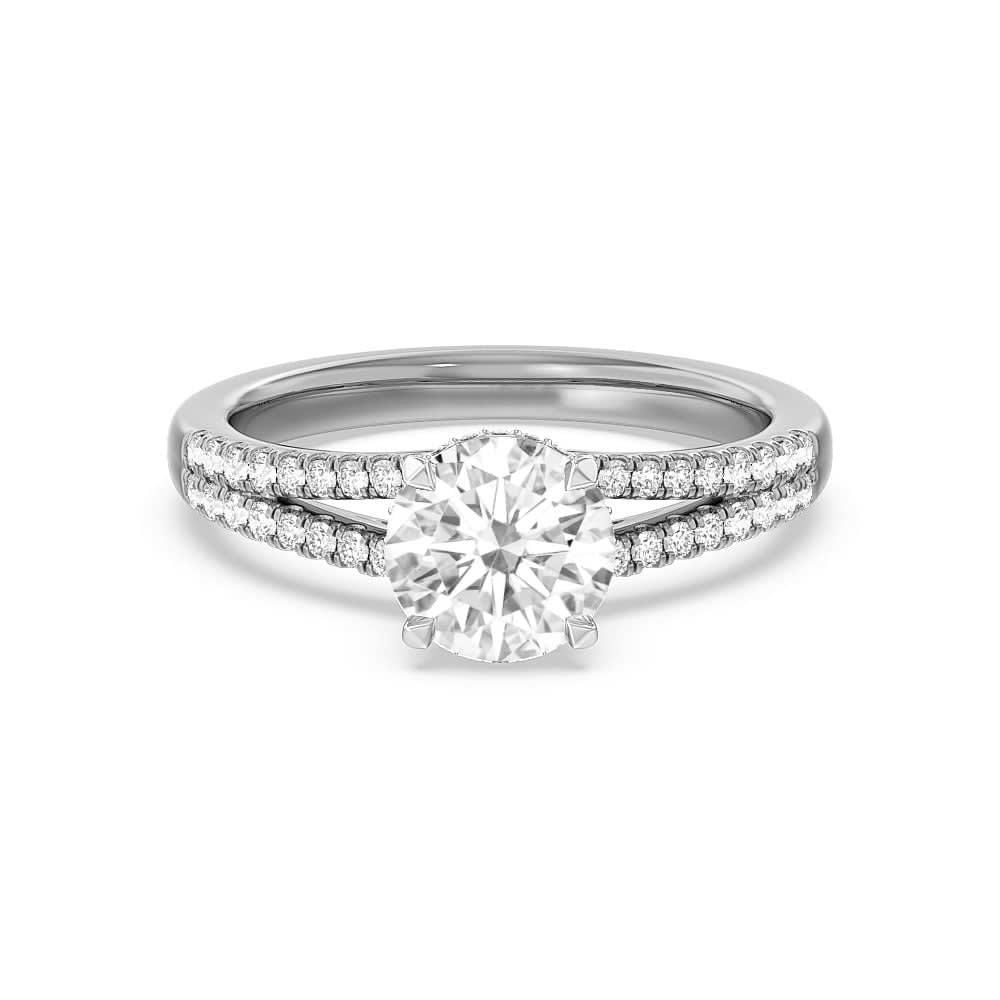 This women's engagement ring features a round lab grown diamond at its centre.The diamond is surrounded by a hidden halo of smaller diamonds that create a sparkle around the centre stone. The shank splits into two strands that curve around the centre stone and meet at the back of the ring, where they merge into a single band. All Temple and Grace jewellery is beautifully crafted to the highest standards and is made at our jewellery workshop directly by us (skilled jewellery craftsmen). This is why you can save over 40% when compared to high-street retail prices. We also offer a lifetime warranty and unmatched 100 day returns. You can shop online or book an appointment to visit our jewellery boutiques in Sydney, Melbourne, Brisbane and Perth.