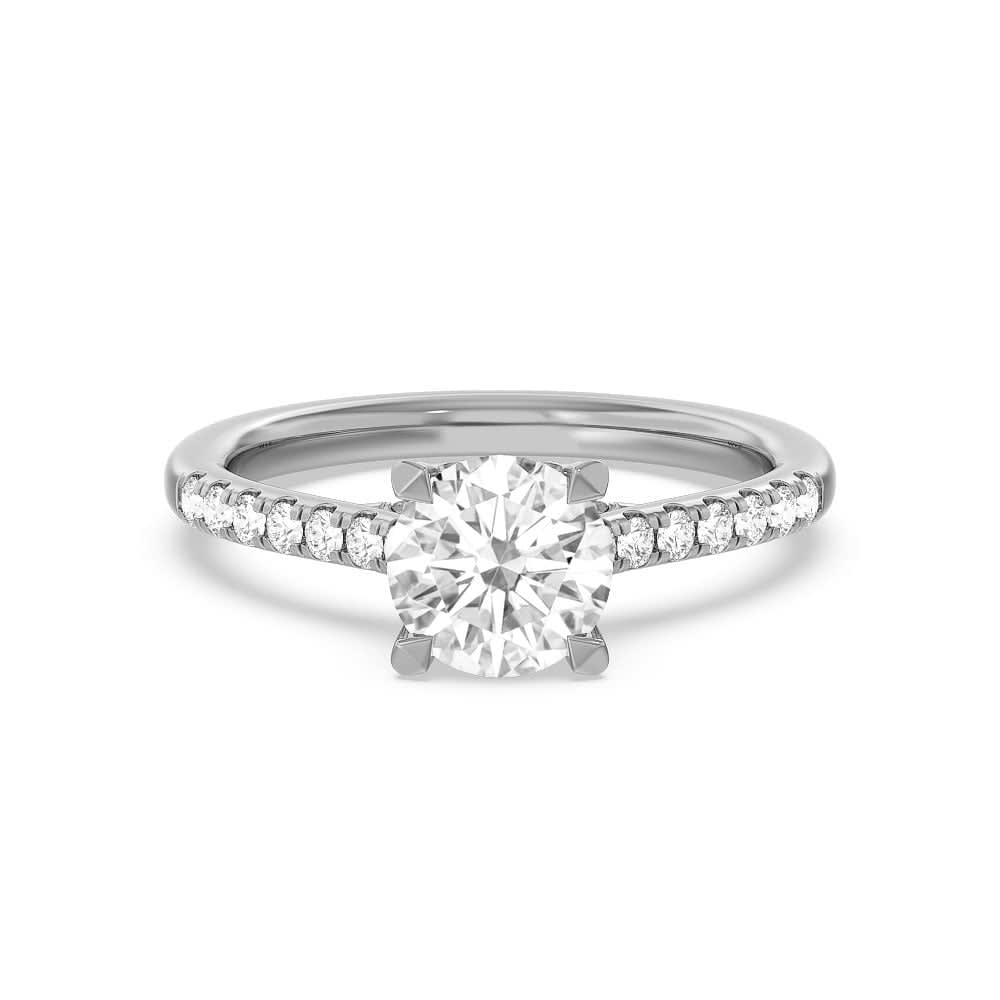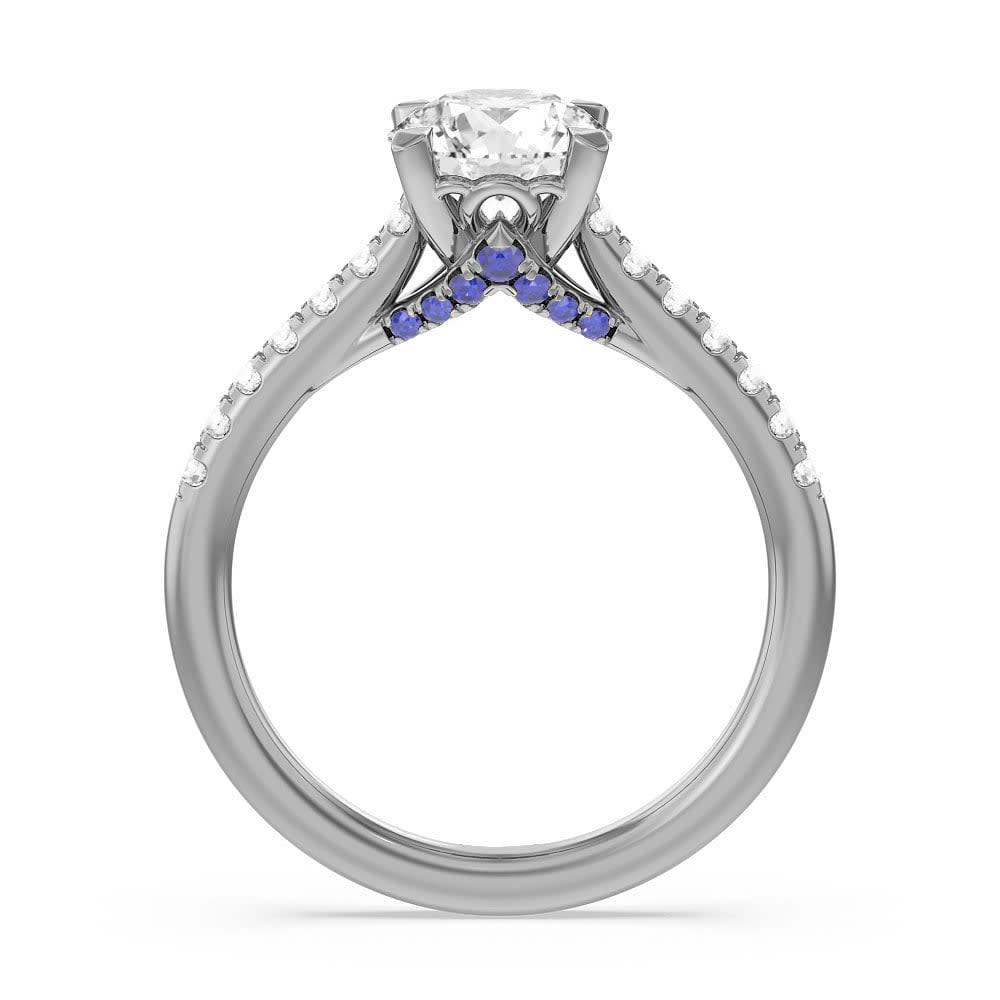 This women's engagement ring features a glittering round brilliant cut lab grown diamond held in place by four claws, which provide a secure setting and allow the maximum amount of light to enter the stone, enhancing its brilliance and sparkle. The band is pave set with round diamonds halfway creating a beautiful and elegant accent. The blue sapphire that is placed underneath the centre stone adds a pop of color and provides a subtle and unexpected accent to the ring. All Temple and Grace jewellery is beautifully crafted to the highest standards and is made at our jewellery workshop directly by us (skilled jewellery craftsmen). This is why you can save over 40% when compared to high-street retail prices. We also offer a lifetime warranty and unmatched 100 day returns. You can shop online or book an appointment to visit our jewellery boutiques in Sydney, Melbourne, Brisbane and Perth.