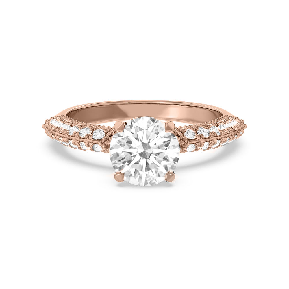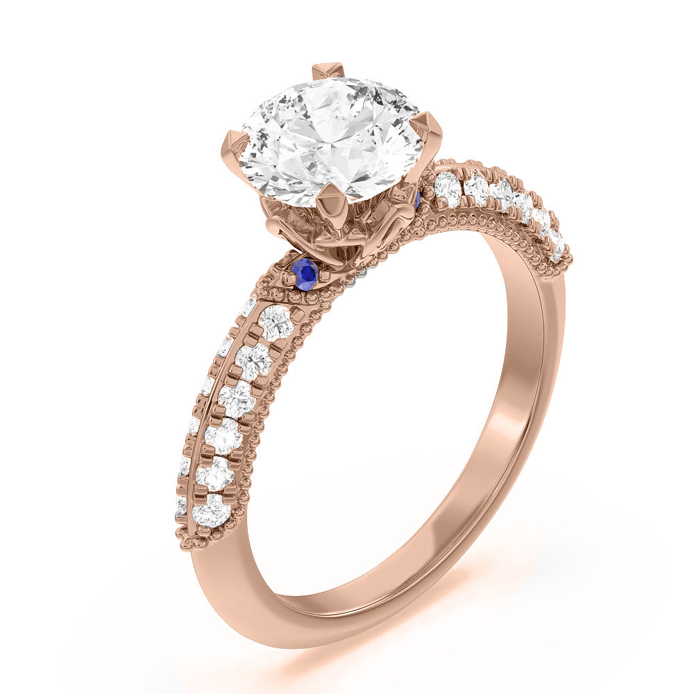 This women's engagement ring is draws inspiration from the rarest blue orchid. The ring features a sparkling diamond studded knife edge shank that creates a contemporary look while still maintaining a classic elegance. To add an extra touch of sophistication and beauty, the ring also features a fine milgrain and created blue sapphire shoulders. The use of created blue sapphires adds a pop of color and creates a unique and eye catching design. Completing the look of the ring is a decorative orchid basket, which adds a touch of whimsy and femininity to the ring. All Temple and Grace jewellery is beautifully crafted to the highest standards and is made at our jewellery workshop directly by us (skilled jewellery craftsmen). This is why you can save over 40% when compared to high-street retail prices. We also offer a lifetime warranty and unmatched 100 day returns. You can shop online or book an appointment to visit our jewellery boutiques in Sydney, Melbourne, Brisbane and Perth.
